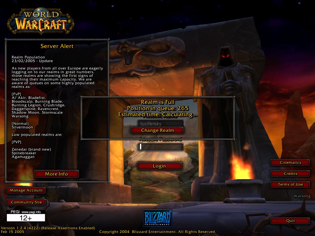Это должен был быть я. Но при коннекте к Варсонгу мне вежливо предложили встать в очередь на 32 минуты Поскольку я, несмотря на ADSL, за вечер хоть раз теряю коннект с сервером, то я испугался и продолжил играть на Thunderhorn. Очереди нет, но и русских не видно. Кстати, по моим данным, в Волгограде продано 15 коробок (через PClub и Видеолэнд). 15 человек - это команда, между прочим. На сундук мертвеца Mr_DeadHead, Eternal, Lucifer - этих граждан здесь вижу. Мож, кто еще отзовется и начнем на незагруженном сервере, пока сильно то не прокачались? Да и реалм поближе можно выбрать, Близзард рекомендует по географическому признаку выбирать, а Варсонг аж в Англии. Тем паче что совсем бросать своих перцев необязательно, я за 2 вечера поиграл двумя чарами. Теперь я друид 8-го уровня на Shadowmoon и маг 10-го на Thunderhorn.