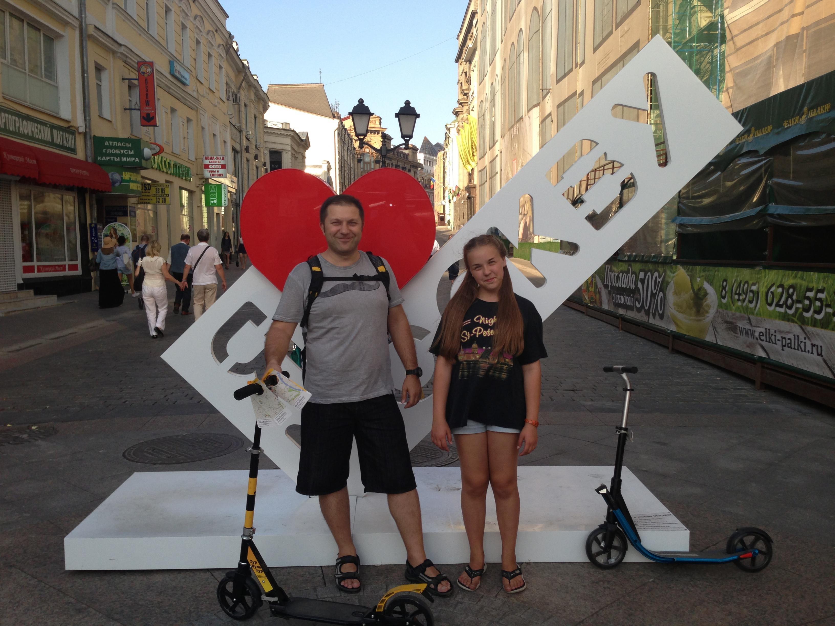 Сегодня опять по центру Москвы на самокатах ездили. Это вам не пешим ходом ноги сбивать Я с младшим систером. Я с краю
