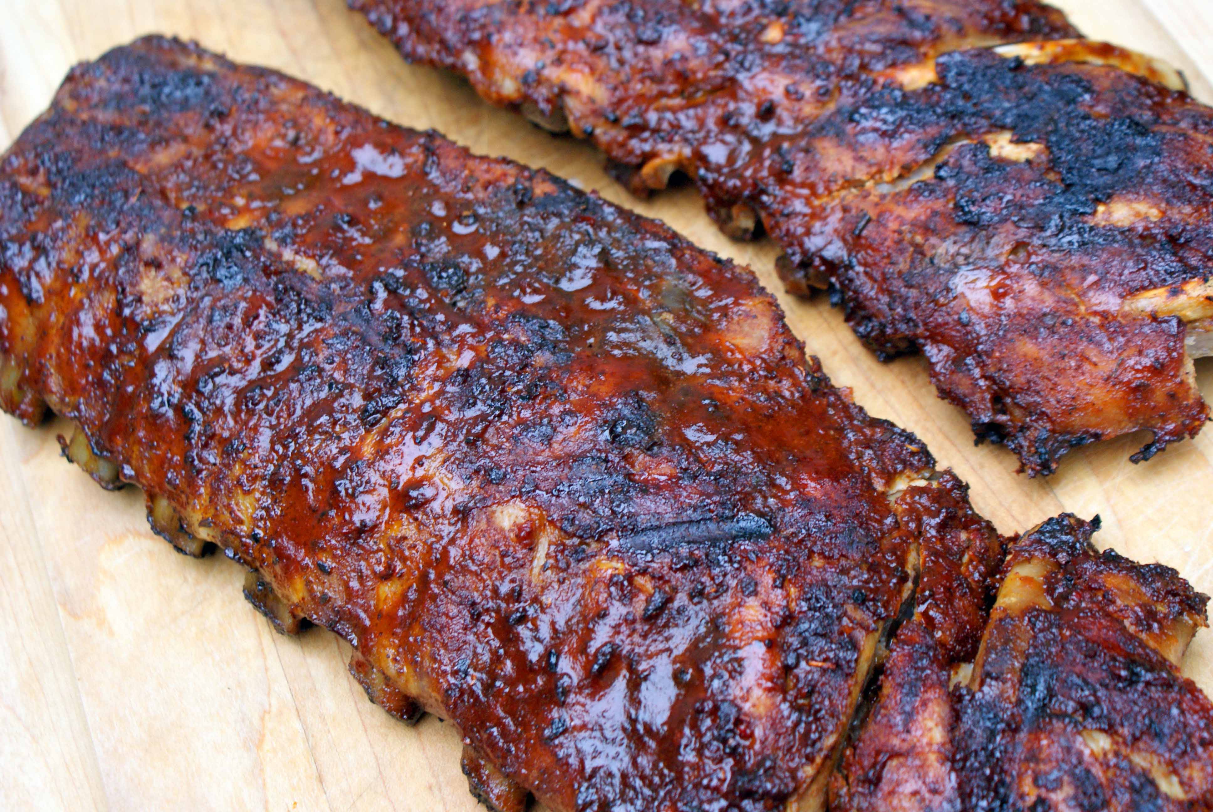 Соль нафик, лук нафик... Можно, конечно, как-нибудь помариновать, но это дело вкуса. Это необязательно. Рубить - вообще нафик. Берётся rack целиком, бросается на решётку, и готовится в режиме low часа полтора-два. Периодически переворачивать. Соус по вкусу, потом. На углях тоже можно сделать, но больше геморроя. Сначала приготовить угли, на это нужно время. Потом те же полтора-два часа на углях, что довольно сложно... для хорошего результата желательно иметь подвижную решётку. Также можно отдельно готовить новые угли и подкладывать их в процессе готовки.
