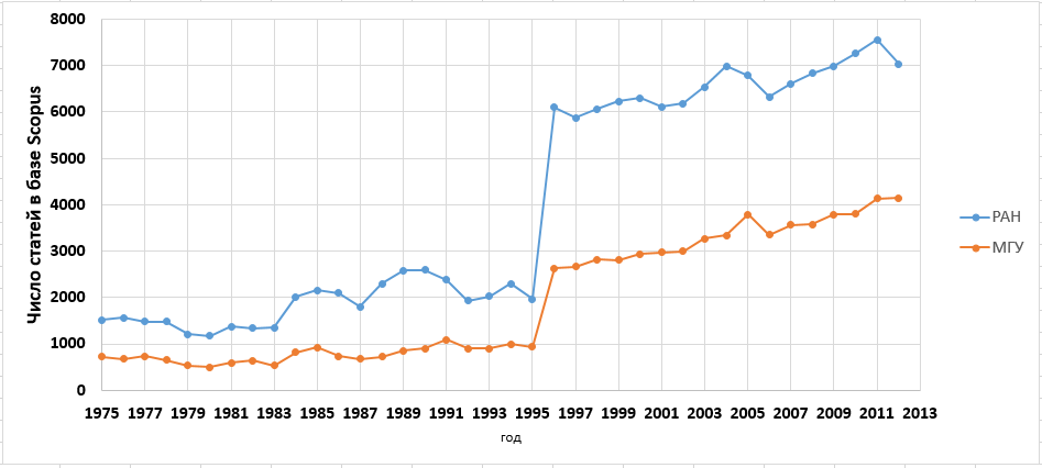 Пока вот, по скопусу. Для сравнения - МГУ.Количества сравнивать нельзя(только тенденции), потому что в МГУ куча народу из РАН работает=статья может быть написана совместно. Это касается именно ВУЗов - им нужны РАНовцы, а не наоборот, как правило