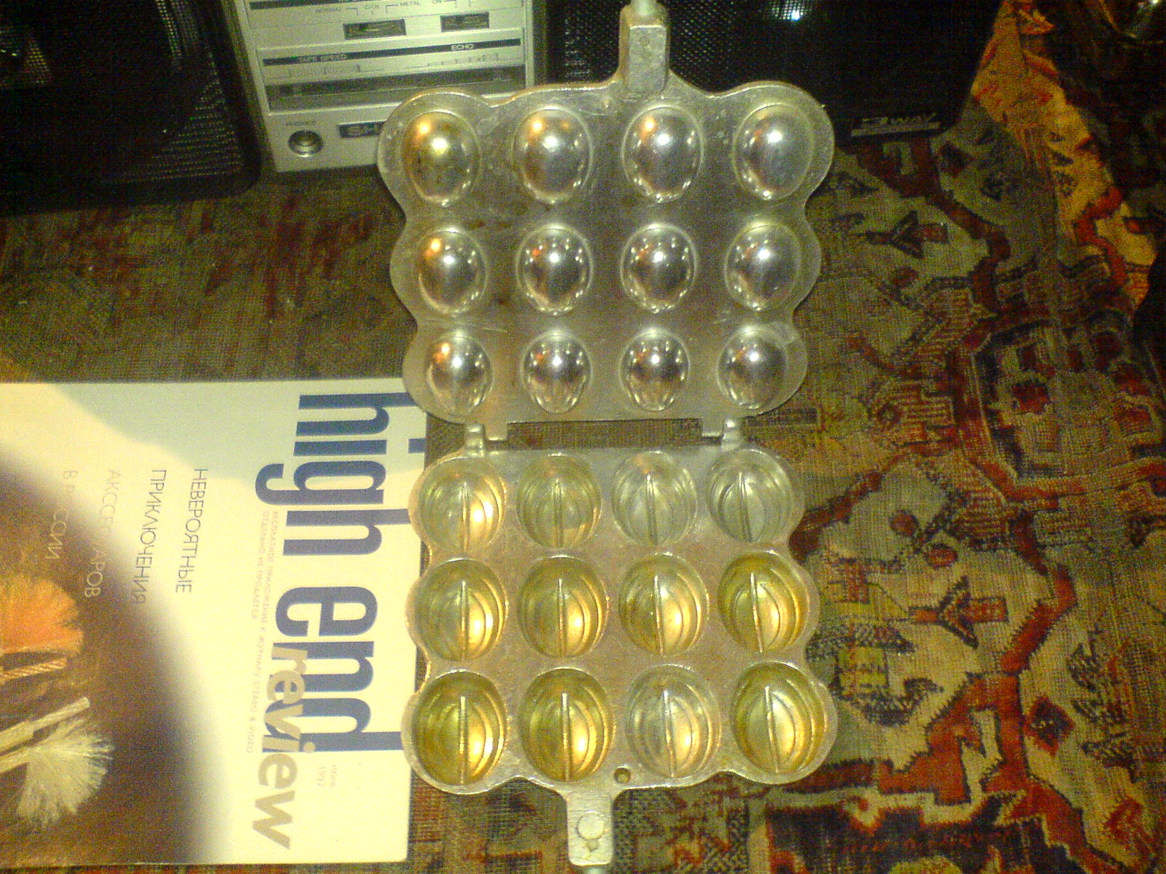 А орешницу такую купила на молотке, половинки разъемные, не скреплены вместе, орех посредине круглый, выдавливающие тесто шишки хорошо выпуклые, стенки орешек получаются тонкие.