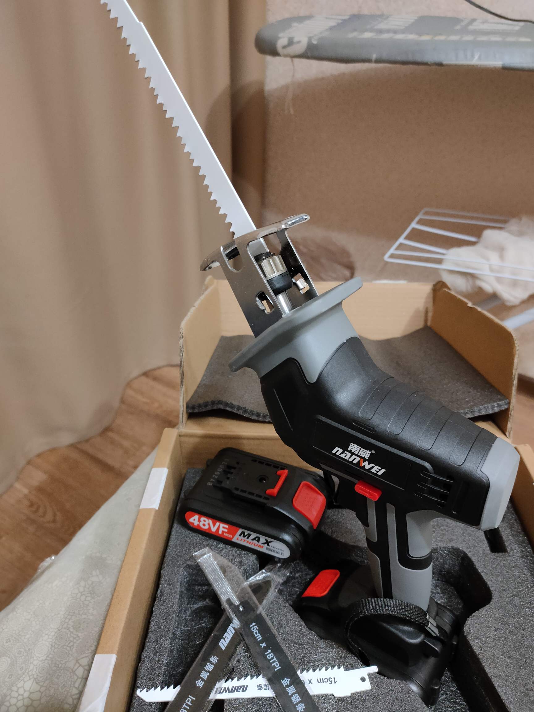 В теме про опиловку был разговор о пилах. В Китае нашел мелкую цепную пилу... Но что то передумал. Вместо этого за 4к взял китайскиую аккумуляторную сабельную пилу . Сегодня получил. Прикольная вещь. Можно держать одной рукой. Есть упор. Довольно сбалансирована. В руке лежит удобно. Качество пластика хорошее. Лучше чем у дешёвых шуруповертов, что щупал в Леруа. Два АКБ на 21в 2а.(не знаю, на сколько честные) В комплекте 4 пилки. Две по дереву и две по металлу. В целом жужит хорошо. Ни чего не гремит. Обороты кнопкой регулируются. Есть переключатель направления (как у шуруповертов). Но его роль иная. В одном из положений просто блокируется работа. Типа предохранителя. Что бы при замене полотна не отпилить пальцы. Из минусов, немного искрит двигатель. Постоянно. Но думаю, притрется, пройдет. В этой маленькой метабе, понравилось, что индикатор АКБ адекватный. 3 диода полный заряд. 2еще норм, но уже садится. 1 ещё работает, но пора на зарядку. Время зарядки, кстати, 40 минут (судя по отзывам с профильных сайтов). Да и работать, если крутить шурупы, говорят можно пол дня, день