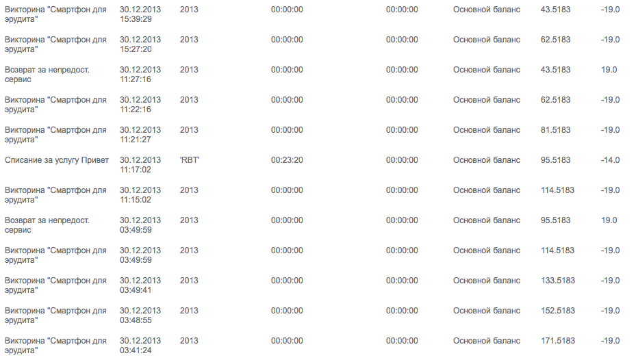 Причем чтобы подписаться на этот эрудит, нужно было отправить слово STOP на короткий номер, и в подписках этого эрудита билайновского нету, вот **** Почитал форумы, билайн не только мою бабушку подписал, сволочи! А еще очень много пожилых людей, именно пожилых! 300р украли, и так каждый месяц! Я долго не принимал это во внимание, думал бабушка много разговаривает, но она мне говорила что, говорит очень мало... Я ***** не поверил, думал она звонит на городские... ---------- Сообщение добавлено 31.12.2013 16:55 ---------- На этот эрудит БИЛАЙН подписал нас прям на декабрь, когда конкурс проводился, ****