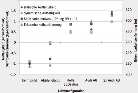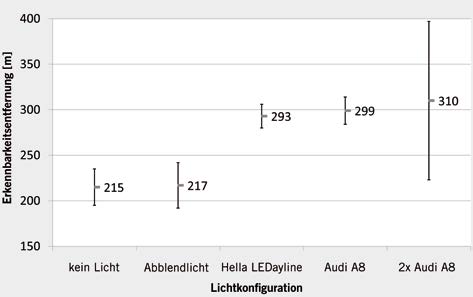 3aвулoн, понимаете, я не привык пустословить. И если я сказал - научное исследование, то оно таким и является. У меня есть доступ к хорошим трудам на автомобильную тему. Данное исследование было произведено 3мя инженерами кафедры световой техники технического университета г. Дармштадта (Dipl.-Ing. Nils Haferkemper, Dipl.-Wirtsch.-Ing. Jan Holger Sprute, Dipl.-Wirtsch.-Ing. Christoph Schiller) под руководством завкафедры Prof. Dr.-Ing. habil. Tran Quoc Khanh. И там действительно указано про 4 секунды. С 500м да, я очепятался, лишний ноль, средняя скорость по городу как раз чуть ниже 50км/ч. Не буду сейчас пересказывать все данные теста, включая измерения светового потока, 3х различных мест, 23 тестируемых объекта итд. Выложу лишь пару графиков. Не сомневаюсь, что перевод вы не осилите, поэтому помогу По оси абсцисс слева направо - без света, с ближним, Hella LEDayline, одна фара ДХО от Ауди А8, 2 фары. По оси ординат - на левой стороне - насколько заметно ТС, а с левой стороны средняя удалённость ТС. Легенда точек сверху вниз - статистическая заметность, динамическая, уровень видимости и треугольник - расстояние на котором заметно ТС. на этом графике заметны средние расстояния на котором были замечены ТС. Маркировка оси ординат - та же, что и на первом графике