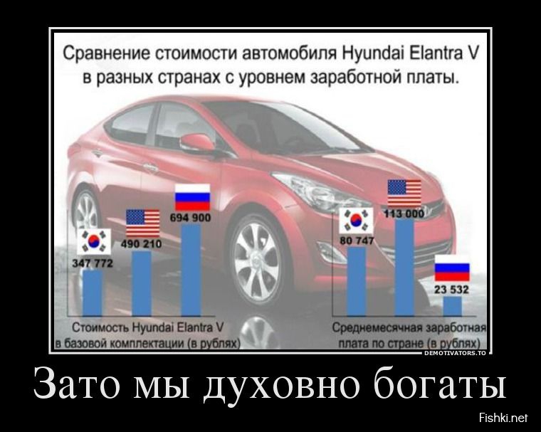 ну смейтесь. А чеж Америку не привели в пример? там люди деньги считать умеют. И если не нравится голосуют долларом. https://www.hyundaiusa.com/elantra/ 16965 $ = 543000р Или ОАЭ http://uae.yallamotor.com/new-cars/hyundai/elantra/2013 AED 54,900=14837$=474000р А вот по тойоте камри в Америке и ОАЭ стоит 20500$=656000р http://www.truecar.com/prices-new/toyota/camry-pricing/ http://uae.hatla2ee.com/en/car/price/toyota В России 969000=30281$. А теперь еще прибавим что з/п тех же рабочих на заводе, продавцов, водителей и т.д. в США раза в 4 выше, т.е по идее и конечная цена должна быть выше. Это я уж молчу, что доходы населения просто не сопоставимы. Что должно тоже как-бы снижать цену(для нас). А все из-за того, что сделали огромный таможенный налог, чтоб защитить наш любимый Автоваз Они же теперь собираются в России, и типа мы вступили в ВТО. Но всем по**й, как же приорка будет стоить как соляра или поло, ее ж покупать не будут