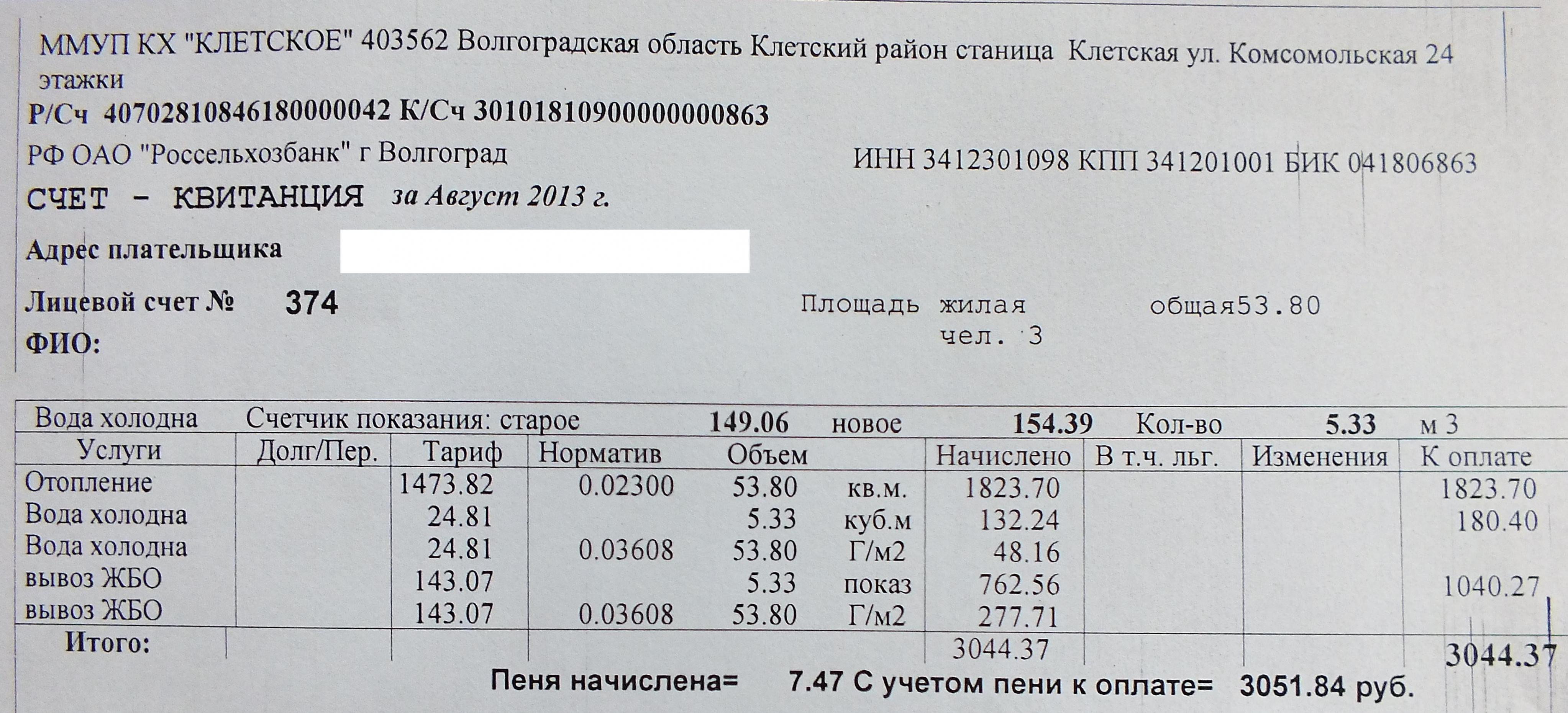 Имеется вот такая платежка, по ней есть 2 вопроса. 1. Почему вода холодная считается 2 раза, по счетчику и по нормативу, законно ли это? 2. То же самое про вывоз ЖБО, 2 раза, по водяному счетчику (сколько мы вылили, столько они и вывезли), и опять таки по нормативу. И вообще, так ли должна начисляться плата за вывоз ЖБО, или наши коммунальщики нас дурят? Хотелось бы услышать ответ специалистов, чтобы было с чем идти ругаться в коммунальный.