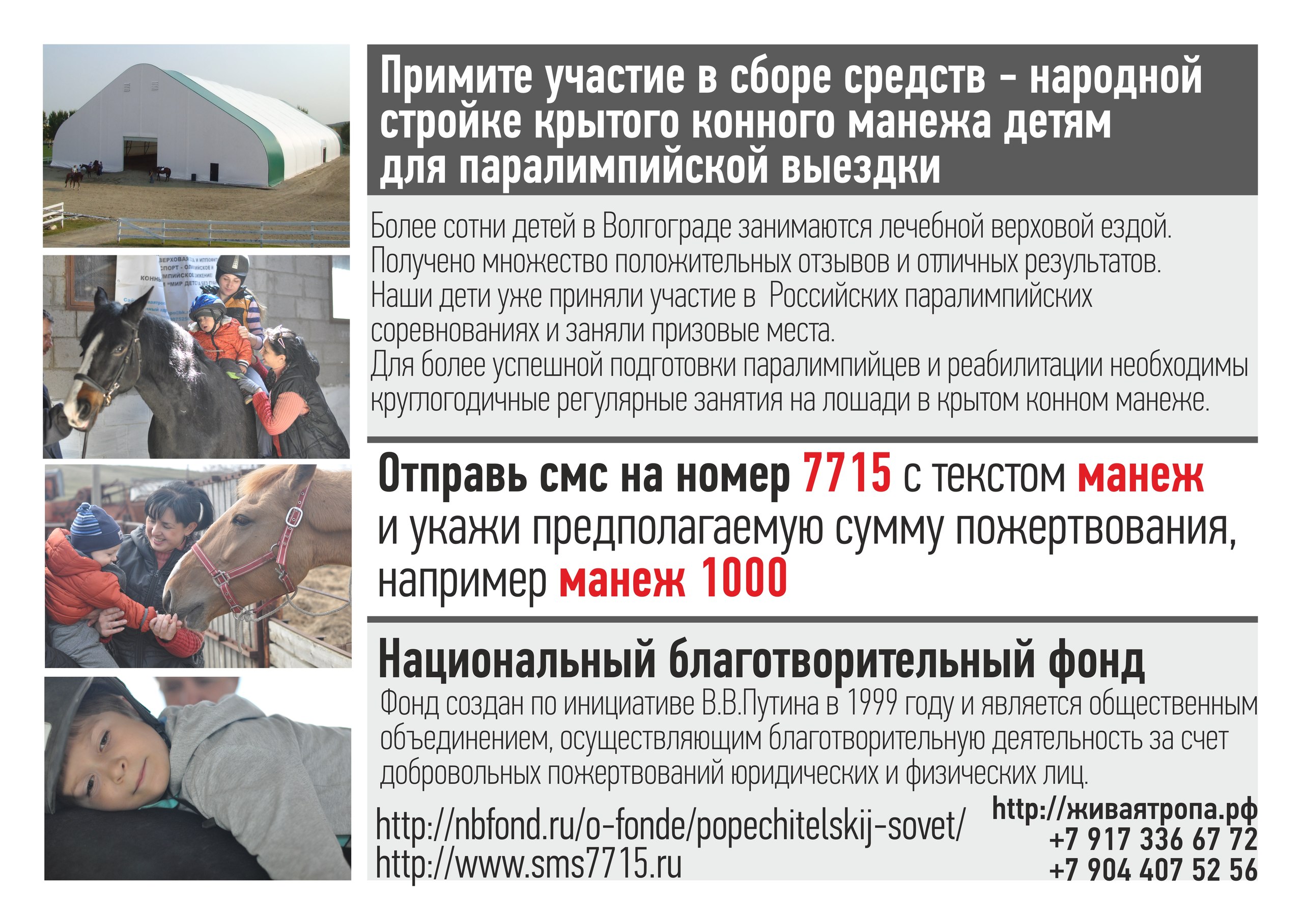 По просьбе клуба размещаю здесь, все вопросы можно задать по указанным ниже телефонам. Дорогие наши друзья, соратники! Наш Семейный Конный Клуб «Живая Тропа» обращается к Вам и всем Вашим друзьям и знакомым с просьбой принять участие в сборе денежных средств на строительство крытого конного манежа в Волгограде для круглогодичных занятий детей с ограниченными возможностями с целью оздоровления, реабилитации и подготовки к соревнованиям по паралимпийской программе. Наш Клуб начал свою работу летом 2008 года. Тогда у нас была одна арендованная лошадка, два инструктора, пять детей и занятия в чистом поле. За семь лет существования Клуба многое произошло: радость маленьких детских успехов и сомнения, первые детские шаги и трудности, первые конные соревнования и отчаяние, вера и помощь родителей и равнодушие тех, кто мог бы помочь. Сейчас у нас своя конюшня (хотя и в аренде), семь лошадок, команда инструкторов, коноводов, волонтеры-единомышленники, поддержка родителей, а самое главное, есть те, кому нужна наша помощь!!!! Ежегодно в Клубе проходят реабилитацию более ста детей. В нашем центре появились традиции: ежегодные новогодние праздники, весенние и осенние спортивные соревнования-праздники. В 2014 году трое наших ребят приняли участие в соревнованиях на Кубок Москвы и заняли первое, второе и четвертое место. Конечно, трудностей очень много, но когда видишь детские лица, из глаза, улыбки, когда их ручки тянутся к носику лошадки, глазкам, ушкам, хвостику, пугаются и тянутся вновь, смеются и «требуют еще», когда они встают на лошадку и называют себя чемпионами, когда прижимаются щечкой к лошадке и с восторгом кричат «Мама, она теплая!!!», когда командуют «шагом» и она покорно начинает двигаться, когда произносят свои первые в жизни слова «но», «шагом», «стоять», «танцуй», когда каждый день дети благодаря своему другу – лошади побеждают свои страхи, свой недуг, то понимаешь, зачем все это, зачем мы преодолеваем свои трудности вместе с детьми, ради детей. Для многих из них занятия лечебной верховой ездой становится смыслом жизни, возможностью добиться победы над собой, над своей болезнью, стать «как все». Именно для них нужны стабильные, круглогодичные занятия, которые в нашем регионе невозможны под открытым небом. Помимо наших маленьких спортсменов, их родителей еще одним важным вдохновителем, генератором идей является наш руководитель, директор реабилитационно-оздоровительного центра «Живая Тропа» Лейман Александр Иванович. Благодаря ему сейчас у нас появилась возможность осуществить сбор денежных средств посредством SMS-проекта, который организован Национальным Благотворительным Фондом. Мы уверенны, что в нашем обществе есть много людей, которые хотели бы помогать и имеют такую возможность. Мы обращаемся ко всем, кто читает это письмо: примите участие в SMS-проекте и предложите всем знакомым и незнакомым вам людям СОВЕРШИТЬ ДОБРО. Проект рассчитан на длительный срок, осуществление строительства возможно этапами. Обо всем этом мы будем сообщать Вам на нашем сайте. Как принять участие в SMS-проекте? Очень просто! Отправь смс сообщение на номер 7715 с текстом МАНЕЖ и укажи сумму пожертвования, например, манеж 1000 Информацию о SMS-проекте, участниках можно получить на сайте Национального Благотворительного Фонда: http://nbfond.ru/ или http://sms7715.ru/ На на