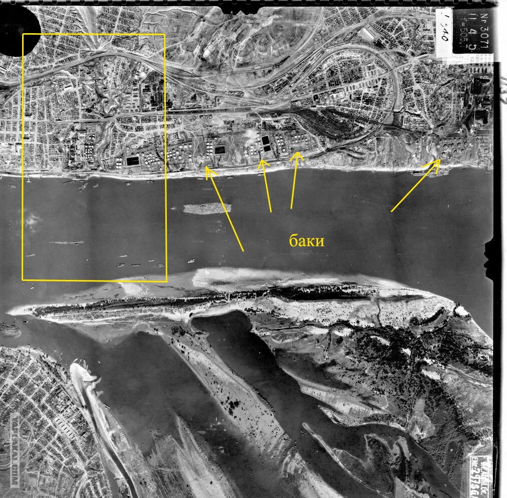 Невозможно делать столь далеко идущие выводы на основе одной фотографии одного маленького фрагментика берега. Вы в курсе, что баки стояли практически по всему берегу, т.к. там стояли предприятия (тракторный, баррикады)? См. фото только окрестностей "теннисной ракетки". Специально обвёл квадратом то, что у вас на фотке. Это менее половины всех баков в районе "лазури". Может все эти баки как раз таки уничтожены или горят? Там этих баков на всех хватило бы и на Чуйкова осталось ещё.. Так что у вас шаткие основания для заявлений. Слуш-те, вы что на полном серьёзе отрицаете массированные действия немцев по Сталинграду в конце августа? Не советую..) Конечно, 2000 самолётовылетов в день - это преувеличение. 8 воздушной армией 23.08.1942 зафиксировано ок. 1500 вылетов по порядкам и тылам 62, 64 армий и Сталинграду. Из них собственно по Сталинграду - 400-500 вылетов. В последующие дни количество самолётопроётов последовательно уменьшалось 24.08 - 1200, 25.08 - 1000. Т.е., если пропорция сохраняется, то за 23-27.08 как раз и наберётся около 2000 самолётовылетов непосредственно по Сталинграду. А это, извините, тоже немало. Это свыше 1000 тонн бомб