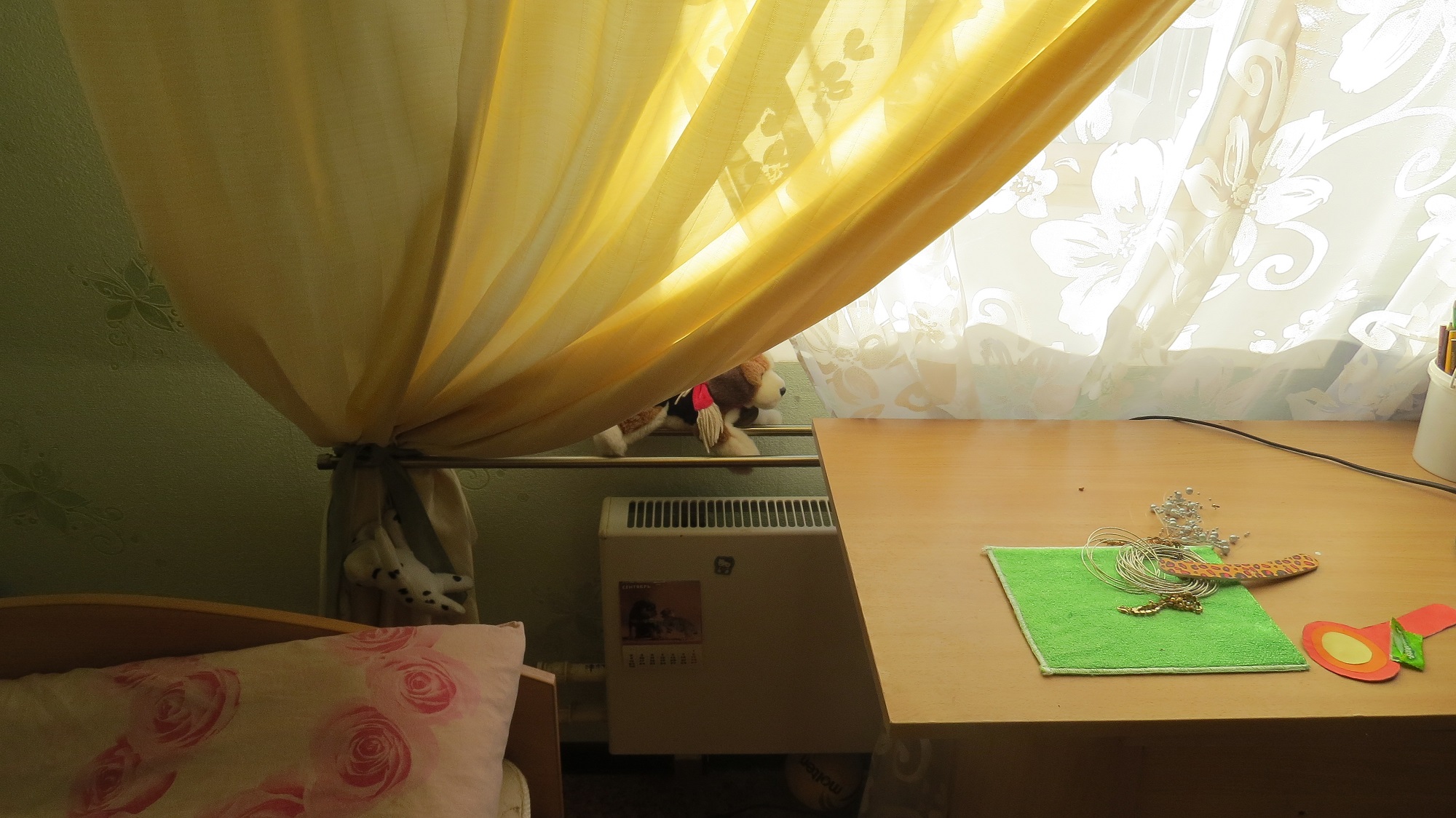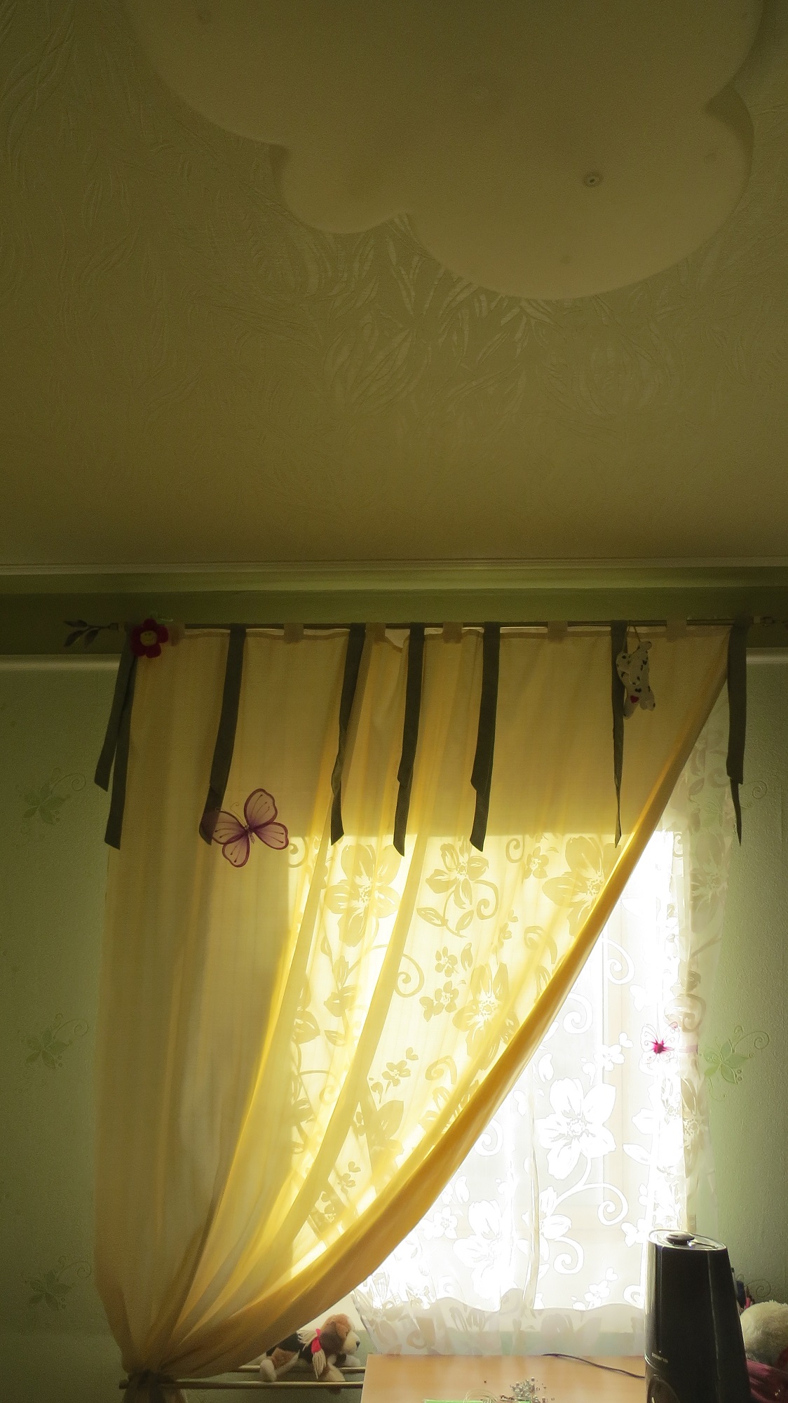 покажу, как оформили окна..Если вешать просто штору - то на полметра от окна отходит. Там где маленькая штора (обошлось все рублей в 400, не больше), по бокам будет еще льняные, но пока не покупали, т.к. не решили, какой ремонт делать. Сворачивать не сворачиваем, она хорошо пропускает свет, тем более сторона солнечная.