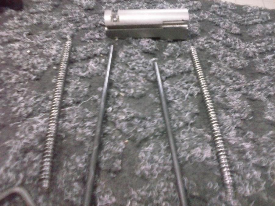Продолжение фото 6 и 7: Крепление ствола к коробке фото 8: Заглушки штоков, с тыльной стороны коробки фото 9: Выдвинутыя для разборки штоки фото 10: Штоки и пружины, на дальнем фоне лежит затвор, где четко видно проточку в его теле, через которую проходит шток с пружиной