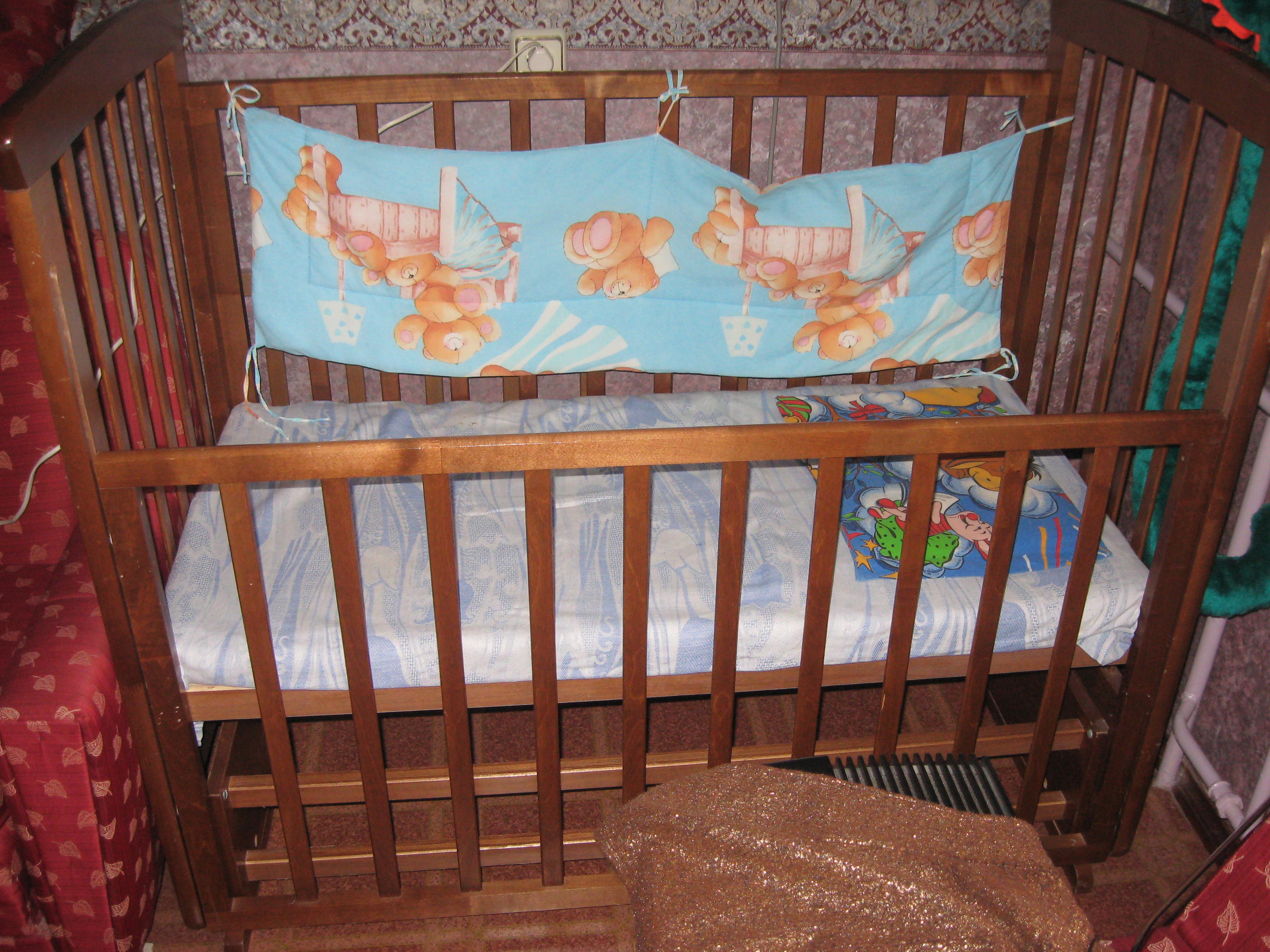 Дерево, продольный маятник на подшипниках, колесики, регулировка дна в двух положениях, матрас ортопедический с бортиками, состояние отличное. 3000 руб.