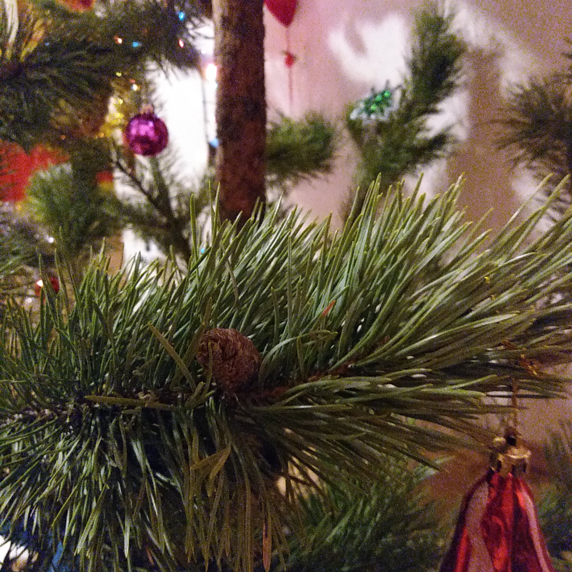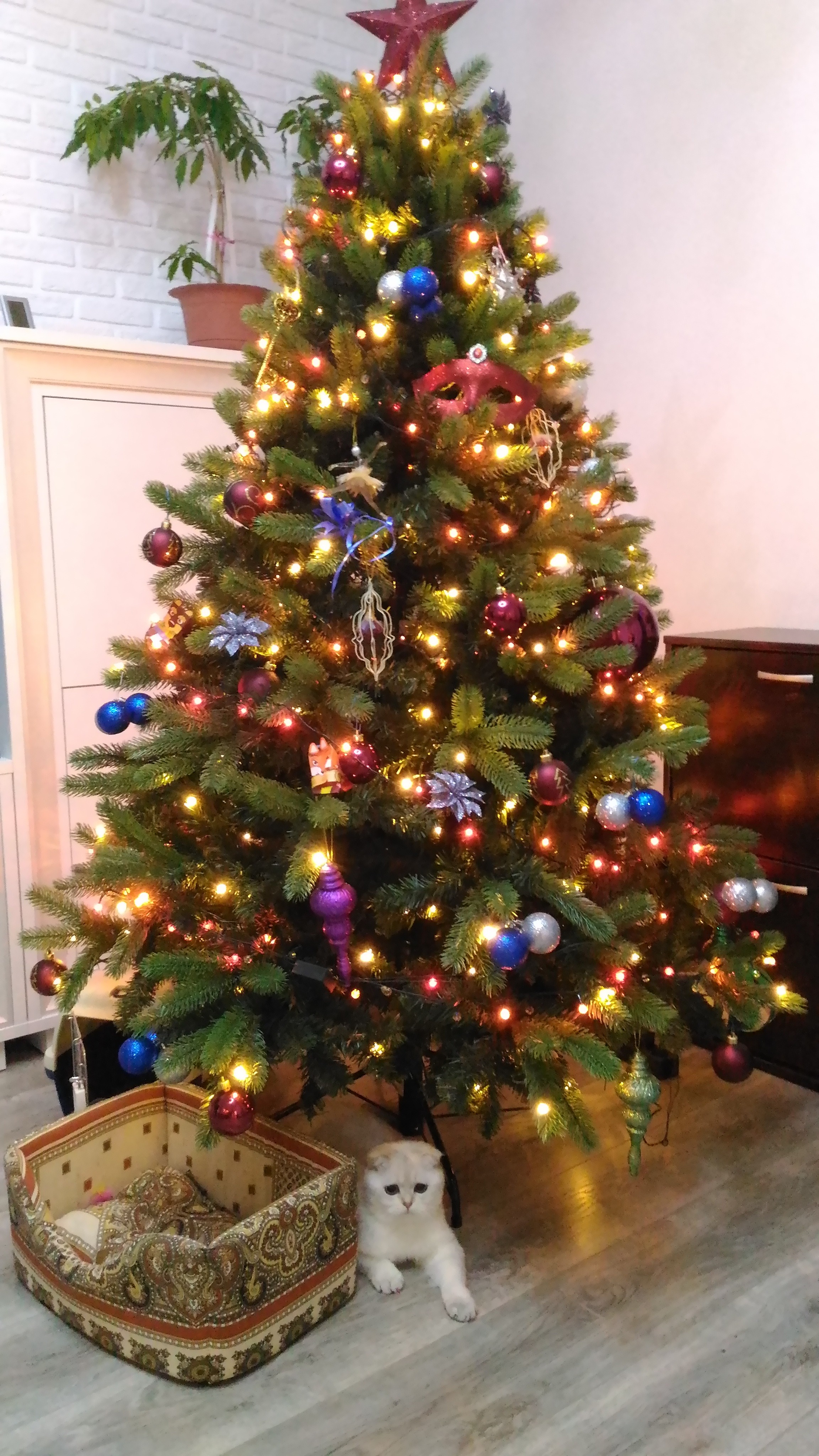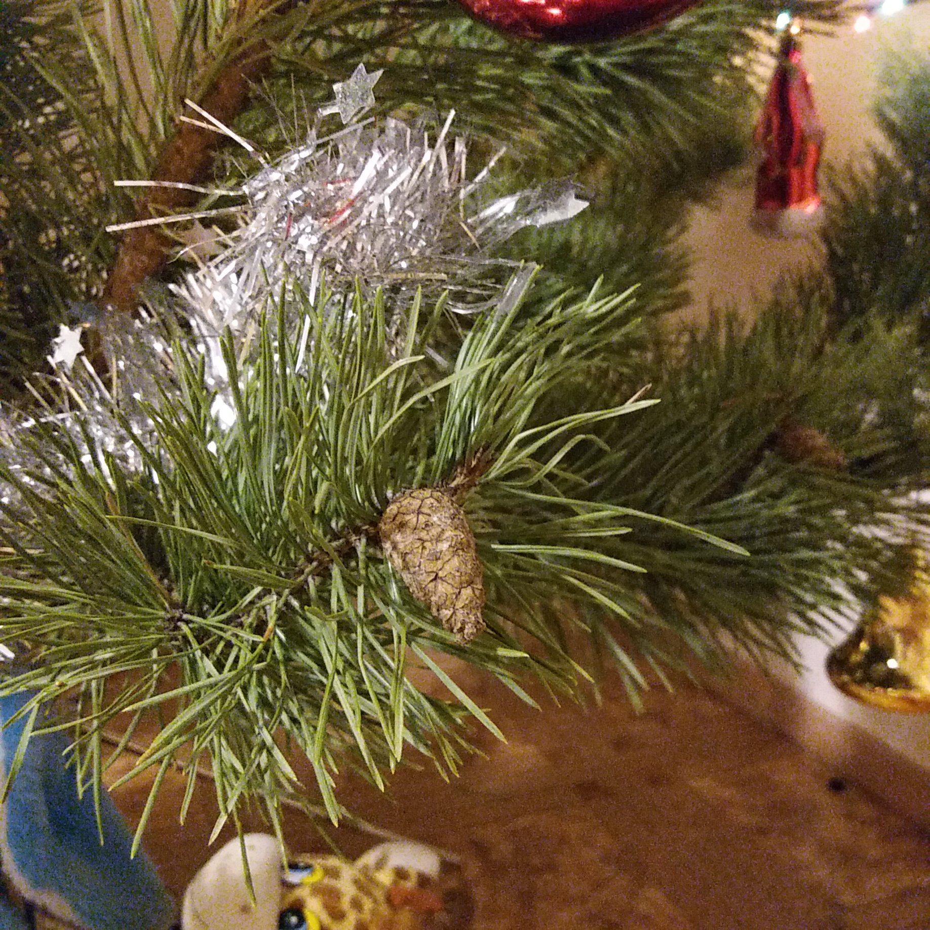 Тож искусственную в этом году поставили, надоело иголки выметать из всех углов, а для запаха пару веточек от живой с краю поставили)