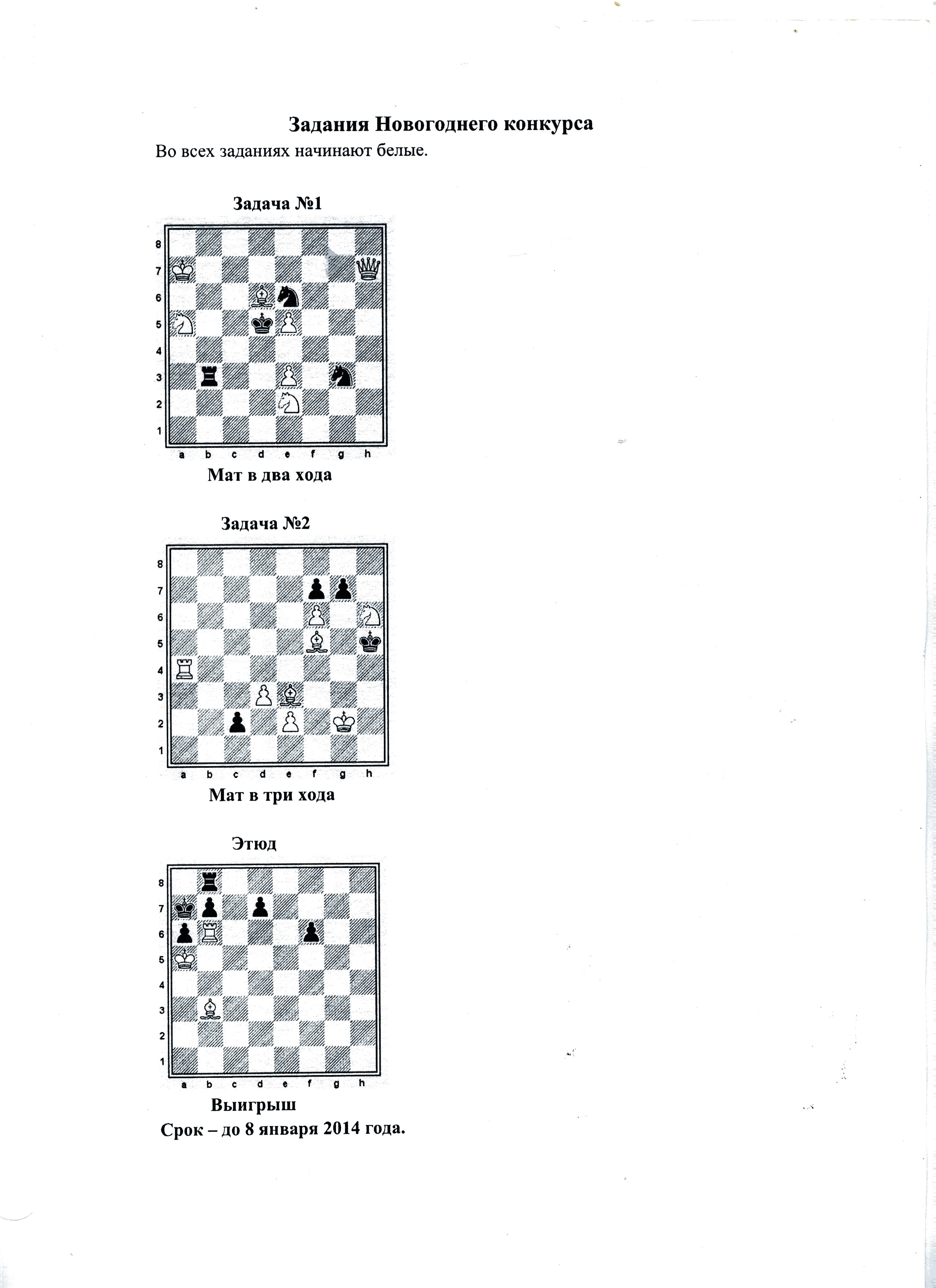 Интеллектуалы волгоградского форума, подключайтесь! Не заскучать в новогодние каникулы поможет традиционный Новогодний конкурс по решению шахматных задач и этюдов. Победители награждаются дипломами и книжными призами, учрежденными волгоградской комиссией по шахматной композиции. Главный судья - неоднократный чемпион области по заочному решению Александр Климашов. Ответы на задания направлять на e-mail: rosinio@mail.ru Срок - до 8 января 2013 года. Во всех заданиях начинают белые.