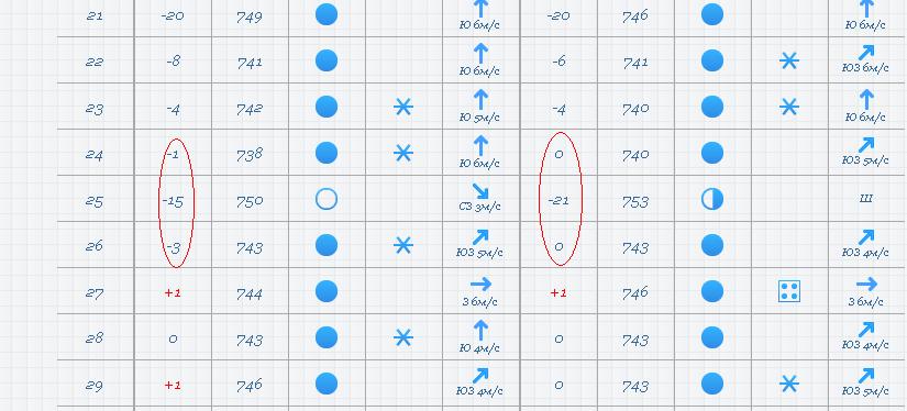 Ну-ну... Вечером оттепель, утром мороз, вечером опять оттепель. У нас было недели две назад. Кстати морозы и перепады меня тут не напрягают. Больше всего гнетет что зимой день короткий, летом белые ночи парить начинают, ну и зима длинючая - с октября по апрель. "Девять месяцев длиться зима, все 12 большая работа" Да ладно. Ты еще про Солнечный Магадан так скажи. Настоящий лес это девственная тайга. И это не прогнозные данные, а реальный дневник погоды. 30/12 - 31/12 - 01/01 тоже весело было.