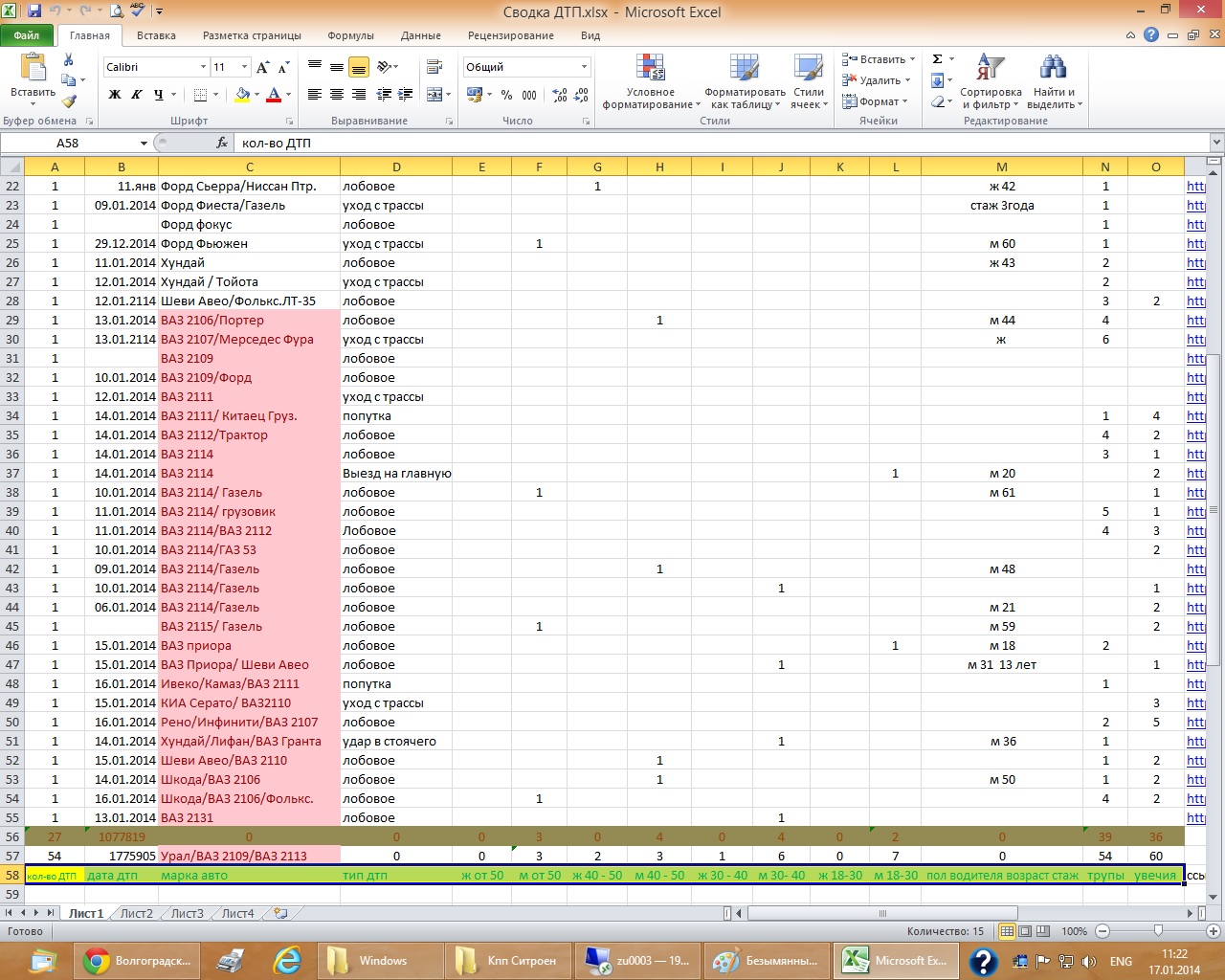 Все время хотел проанализировать ДТП, разобраться в причинах, влияющих на статистику. При некотором "затишье" на работе, попробовал свести в таблицу данные с сайта http://www.rusdtp.ru/ Статистика не только России но и ближнего зарубежья. Проглядел 20 страниц последних дней, учитывал ДТП с погибшими и пострадавшими, исключая наезд на пешеходов. Вот что получилось: вероятность погибнуть в ВАЗах на порядок больше , чем в иномарках, и не обязательно , что неопытная молодежь , создает прецедент для аварии. В иномарках гибнут реже, в основном по неопытности, и пачками, много случаев гендорно-сезонного характреа, особенно яркий пример с упавшим в воду микроавтобусом ( 6 трупов) Прилагаю табличку. у кого какие мысли еще возникнут?