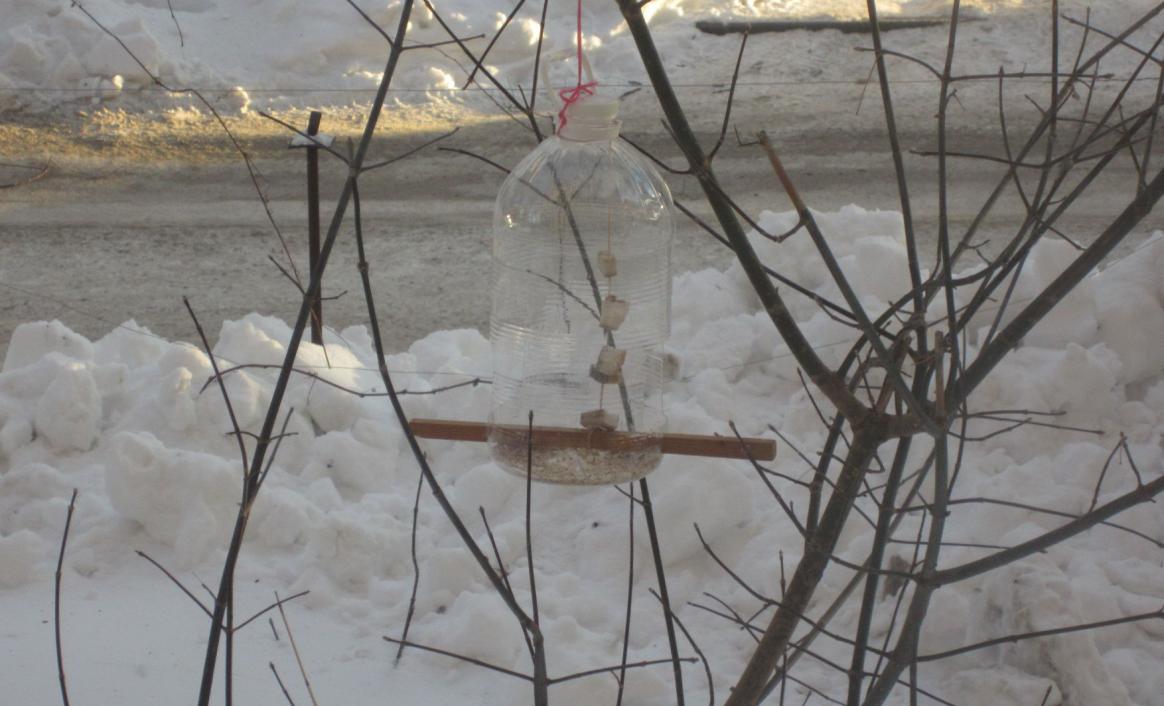 Тоже сделали кормушку. в ней сало на ниточке для синичек и семечки. овсянка и хлеб. изобрели свою конструксию из 5-литр баклажки вот с окна сфоткала