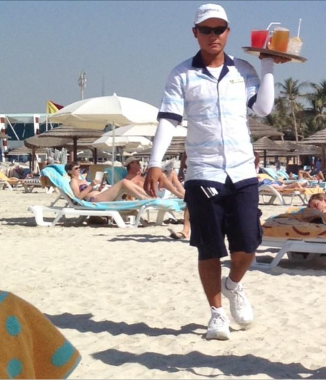 Порой меняет, а порой тупо тырит у через чур закупавшихся русских туристов. Ещё запрещает брать с собой на пляж "свои" еду и питьё. Девушкам предлагает дополнительные услуги вечером после закрытия пляжа. В общем, с ним ухо надо держать востро.