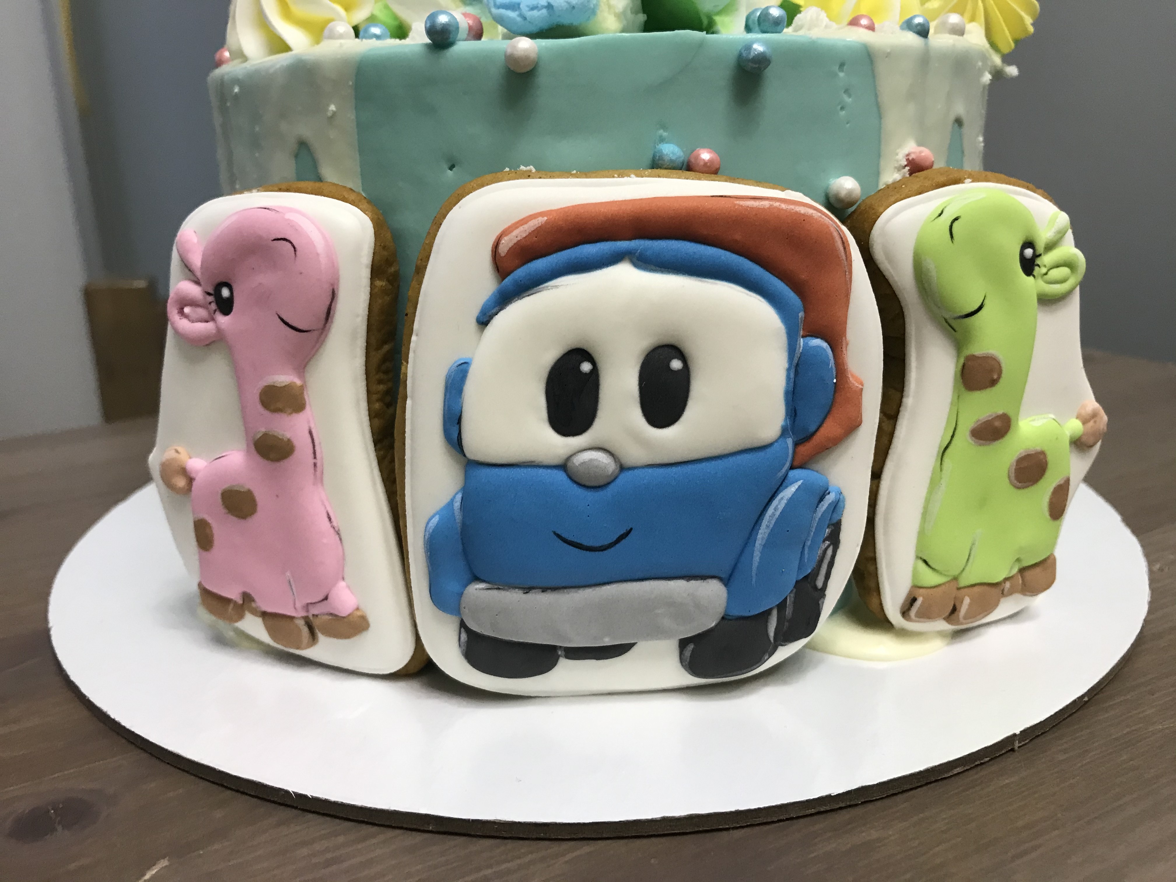 Ну что, сыну два года. Сплю я чуть лучше А вообще, зашла торт показать! Не могу не показать) Он не только красивый, но и вкусный! Клубничный милкшейк. Любимый мультик сына Синий трактор, который мы смотрели почти два года Сейчас перешёл на Лева грузовичок. И два жирафа) Дети одного делили перед сном, красного (он изначально был подарен Даше). Купили Диме, зелёного. Даша теперь ждёт розового, чтоб такой же большой как зелёный Вот потому на торт попали и жирафы) Не моих рук дело))