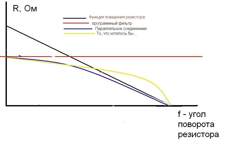 Pashtet, где два резистора, как их валы приводятся в движение, в общем ничего не понятно, поскольку ты сам не особо разобрался, а я не телепат. Ты проблему почти решил, тебя устраивает, ну и хорошо. То, что сажать параллельно резистор не имеет смысла, это я понял. Вообще же для считывания положения вала переменного резистора существует большая гора разных методов, что я обычно при возникновении таких вопросов, как передаточная хар-ка, плотно изучаю схему, да желательно с осциллографом (ибо половина методов базируется на измерении постоянной времени RC с вытекающими отсюда последствиями). Я, честно говоря, в удивлении, что ты этот вопрос так бедно исследовал. Но всё хорошо кончилось, и ладно.