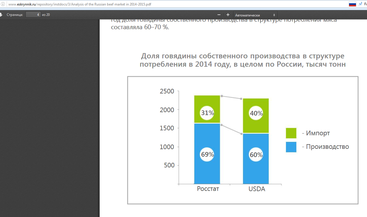 Это скрин из документа госкомстата Вот, по ссылке на госкомстате есть статистика по производству мяса в живом весе по всем типам хозяйств. Из нее можно вычислить количество живой массы на душу населения. Это 95 килограмм на одного жителя страны. Пересчет из живого веса в мясо, можно посмотреть к примеру тут: Вот скрин: берем самый выскоий выход, 70 - по свинине. И от 95 кг остается 71 килограмм на одного человека. С учетом того, что я существенно округлил "в пользу" России - и того меньше. Строка 9 - наглядно показывает за счет чего шел рост. Куры. За время современной России, прирост курей в доле мяса примерно 700 процентов.. И со времен СССР в балансе они круто потеснили другое мясо. Если раньше при Союзе, основой рациона при чуть большем потреблении мяса в целом, была свинина и говядина, то сегодня это куры. ---------- Сообщение добавлено 19.08.2016 01:29 ---------- Сами видите - основной рост производства - за счет кур. А продают говядину при этом. Свинину и кур трудно продавать. По обьему - 4 процента от производства. ---------- Сообщение добавлено 19.08.2016 01:58 ---------- В 89 году производство мяса на душу населения было немного больше чем сегодня в России, и в плюс к этим объемам СССР еще и закупал примерно 20 процентов на внутреннее потребление. При примерно равном сегодняшнем производстве, Россия ПРОДАЕТ. А вы о голоде... ---------- Сообщение добавлено 19.08.2016 02:06 ---------- И при все при этом - жратва не самое плохое что есть в наличии на сегодня.