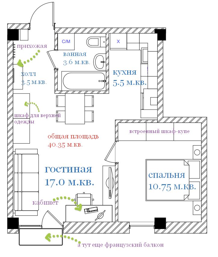 Пособие, как сделать из однокомнатного хруща 37-38 м2 - двухкомнатную :d , но с гостинной без окон :d