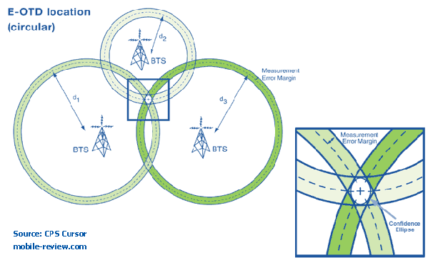 примерно так: http://www.mobile-review.com/standard/gps-in-nets.shtml "...E-OTD-С. В методе измеряется время получения сигнала от базовой станции на мобильный терминал, а также на контрольной точке (базовой станции). При расчетах используется 5 величин: Mobile Observed Time - время, за которое сигнал приходит от базовой станции до терминала. Время рассчитывается согласно показаниям часов мобильного терминала. Location Observed Time - время, за которое сигнал приходит от базовой станции до контрольной точки измерений. Время рассчитывается согласно показаниям часов точки измерения(базовой станции). Смещение(разница) времени между внутренними часами телефона и часами контрольной точки. DMB(Distance from MS to BTS) - геометрическое расстояние от мобильного телефона до базовой станции. DLB(Distance from LMU to BTS) - геометрическое расстояние от контрольной точки измерений до базовой станции. При этом V - это скорость сигнала(скорость радиоволн). Для каждой базовой станции составляется свое такое уравнение. Это делается из-за того, что в системе присутствует три неизвестных величины: позиция мобильного терминала (x,y), а также неизвестная величина смещения. Таким образом, мы получаем именно три базовых станции, необходимых для расчета. Приблизительное положение терминала определяется пересечением трех окружностей, в центре каждой находится базовая станция. Радиус окружностей определяется как время задержки сигнала. Невозможность определения точного радиуса получила название степени погрешности определения координат(measurement error margin). Впрочем, взгляните на иллюстрацию, думаю, все станет понятно..."