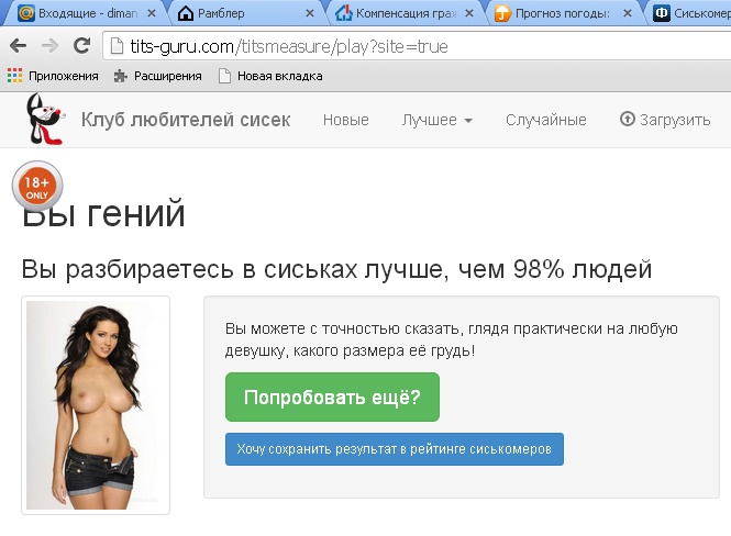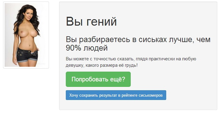 Вы разбираетесь в сиськах лучше, чем 20% людей Боюсь предположить, что вы не видели женской груди вживую. Наберитесь смелости, подойдите к понравившиейся девушке и не упустите свой шанс! решил просто потыкать))))) ахаха))))