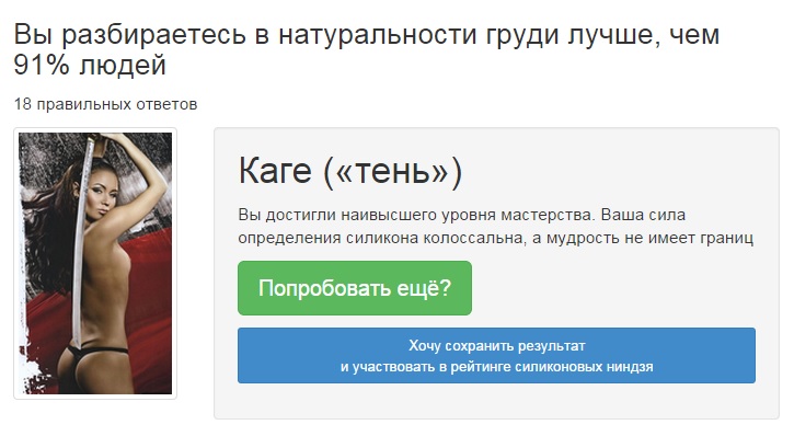 62% Выпускник академии ниндзя. Вы разбираетесь в натуральности груди лучше, чем 31% Вы только собираетесь выпуститься из академии силиконовых ниндзя. Вы изучили теоретические и практические составляющие и готовы применить их в нелёгком силиконовом деле.
