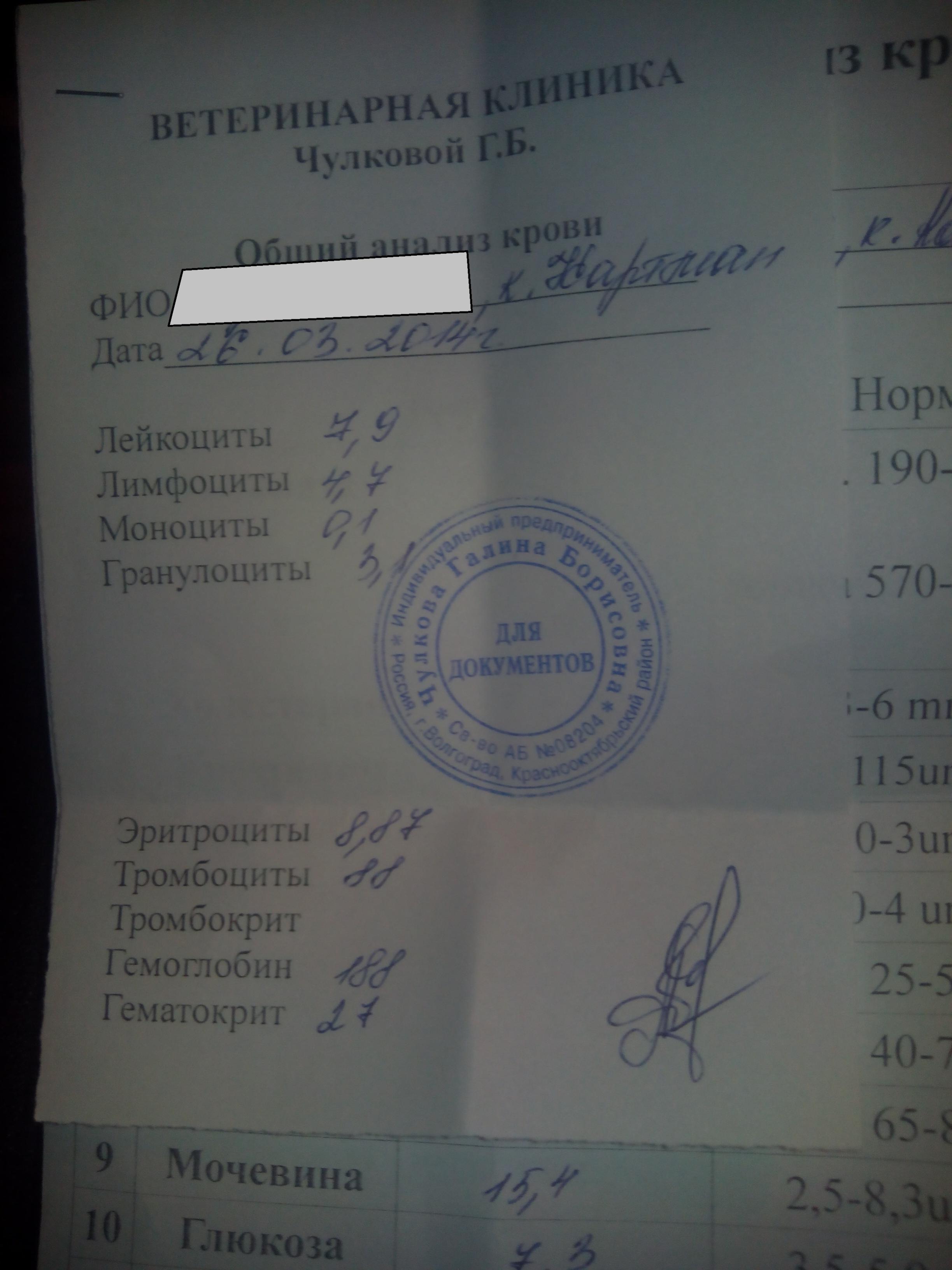 Тут по симптоматике похоже на то что печень сдала и кровопотеря огромнейшая. при таких тромбоцитах надо уже гормоны колоть и капельницы с гептралом и искать причину. ---------- Сообщение добавлено 26.03.2014 21:35 ---------- возможно внутренее кровотечение. причем по нормам чулковой нижняя граница тромбоцитов 150. а тут вообще аут. У нашей скотинке они были 180 и доктор сразу тревогу забил. правда и причину нашел сразу и печень тоже плохие показатели были gerodoth, а моча как у кота. какой цвет? кровь есть? ---------- Сообщение добавлено 26.03.2014 21:37 ---------- мне с клиники Чулковой на почту их присылали.