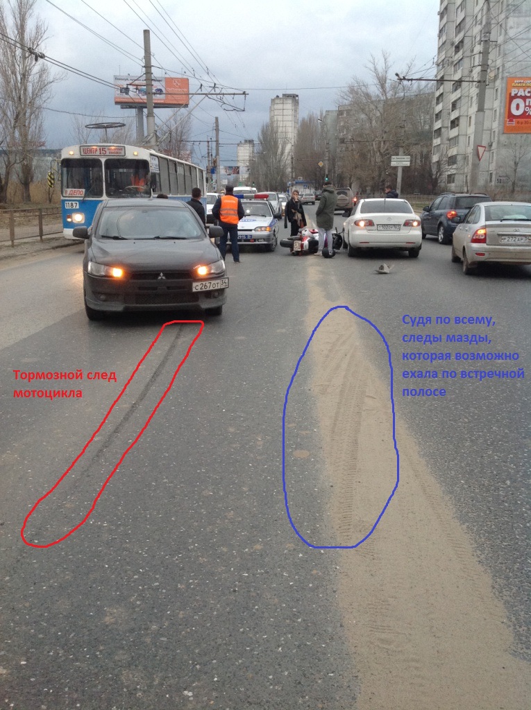 Судя по фотографиям и следам на асфальте мотоцикл двигался в сторону Парк Хауса, также как и белая мазда. Водитель лансера скорей всего был вынужден прижаться в правый ряд. А вот следы на песке, подозреваю, принадлежат белой мазде, ехавшей по встречной полосе. Вот тут наступает интересный момент. Или мотоциклист двигаясь по разделительной полосе, уходя от резкого маневра белой мазды прилетел в лансер, либо они выясняли кто наглее. В итоге водителю лансера не повезло, сочувствую. п.с. Это лишь моя версия, очевидцем данной аварии я не являюсь.