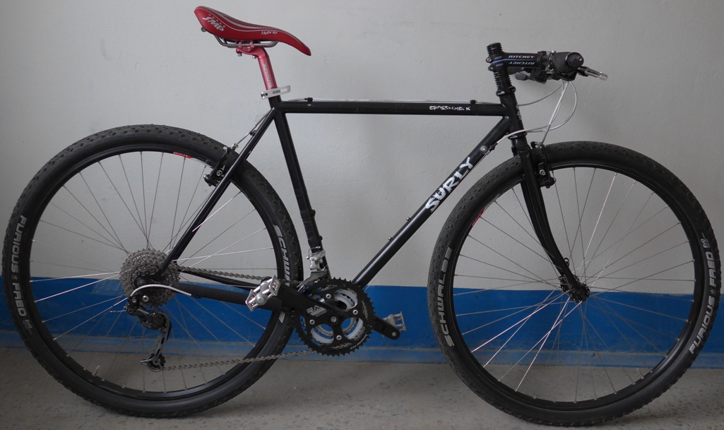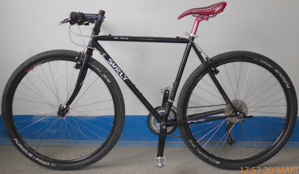 Продаю: Циклокроссовый велосипед Сурли Кросс Чек. Ростовка 52, на рост 170-180см. Рама и вилка – хроммолибденовые. Лэйбл американской компании Сурли (Surly). Произведено на Тайване. Велосипед эксплуатировался 1,5 сезона. Вмятин нет. Только потертости краски. Черная рама легко подкрашивается из баллончика с краской за 200 руб. Передний переключатель (3*9) – Шимано Тиагра. Задний переключатель, длинная лапка (3*9) – Шимано Деор Шедоу. Эксплуатировался 0,5 сезона. Кассета стальная 9 скоростная – Шимано 12*36 Цепь Срам 991. Система стальная туринговая (26*36*48) SRSUNTOURXCTV2 Каретка квадрат 68*118 Втулка задняя Чозен (на 36 спиц) на промах. Втулка передняя Квандо (на 36 спиц) на промах. Обода Алекс Римс DH 19 на 36 спиц , толщина 22,5мм. Спицы нержавейка тянутые. Покрышки (комплект) Швальбе Фьерис Фред 2 дюймовые (50мм) вес каждой 360г. Покрышки (комплект) Швальбе Марафон Мондиал Эволюшн с защитой от проколов 5 класса (47мм) вес каждой 750г. Эксплуатировались 0,5 сезона. Камеры Швальбе, ширина 1,5-2,4 дюйма, залит герметик. Колеса эксплуатировались менее 1 сезона. Тормоза – ви-брейки. Стоят мини ви-брейки, еще обычного размера ви-брейки. Манетки – Шимано Деор. Левую манетку нужно менять. Зажим поседела – стальной фирменный Сурли под шестигранник и алюминиевый эксцентриковый из Декатлона (новый). Подседельный штырь – двухболтовой Ксениум 27,2 мм. Седло – Итальянское – Селе СМП – модель Гибрид. Руль алюминиевый, длина 600, диаметр 25,4. Грипсы анатомические мягкие с фиксаторами. Вынос Ричи, длина (по осям) 110мм, 18*. Багажник хроммолибденовый Тубус Карго, вес 560г. Один серьезный поход. Остальное с легкими сумками. Сумка рамная большая черная новая. По цене: 1. 25000 руб. 2. 22000 руб без антипрокольной резины, сумки и багажника.
