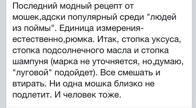 Ваша городская мошка долетела к нам в деревню:frustrate А ведь раньше в деревне её вообще не было, только комары вечером и то ближе к водоему. Но предполагаю, что у меня тут мошки всё же меньше чем в городе Подсмотрела на фейсбуке, обсуждают что помогает)