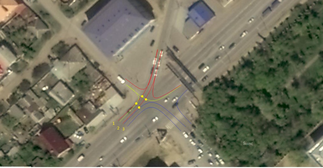Перекресток может быть не только с пересечением 2х дорог, те кто едет сверху с косой улицы фактически на перекресток выезжают с Кубанской и попадают под сигналы светофора которые там установлены, ну а как его проезжать правильно я попытался изобразить на картинке ниже. На картинке там где 4 желтых жирных точки это те места где работает правило помехи справа при проезде перекрестка. Но к сожалению ездят там большинство так как хотят.... особенно поворачивая с Кубанской налево вниз по Рокоссовского с крайнего ряда правого или затыкающие перекресток для проезда с той же Кубанской в час пик.