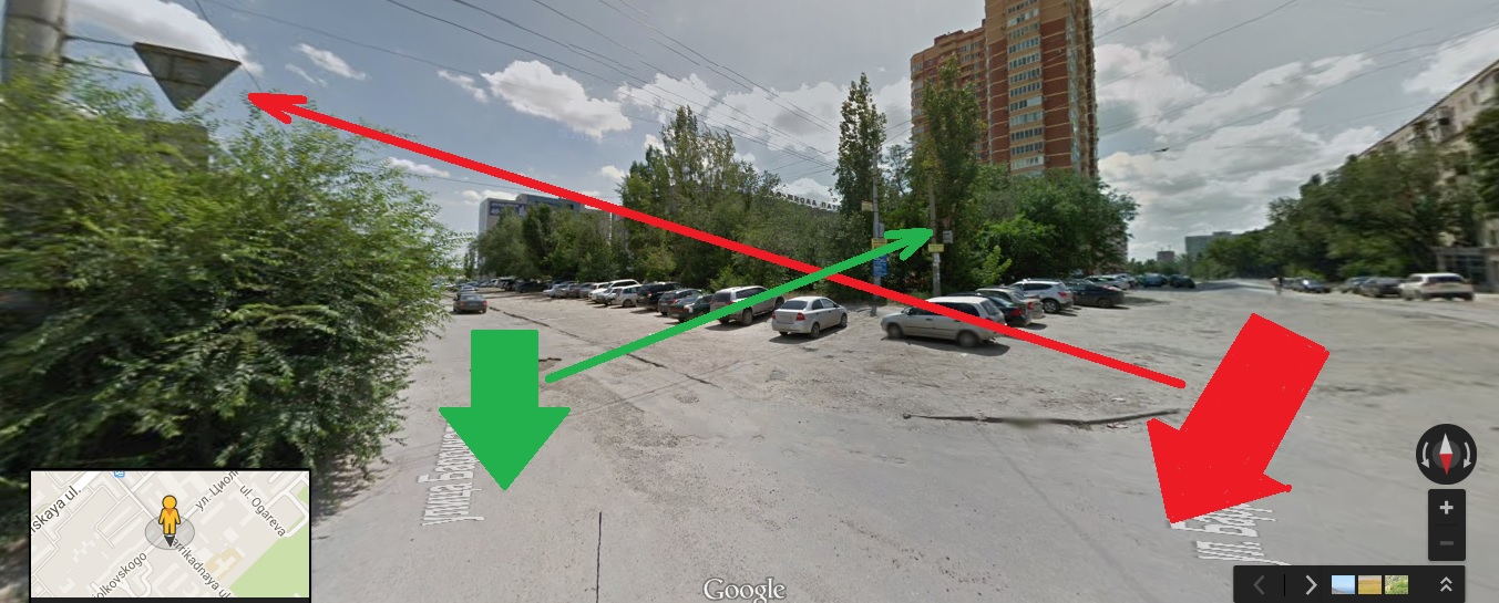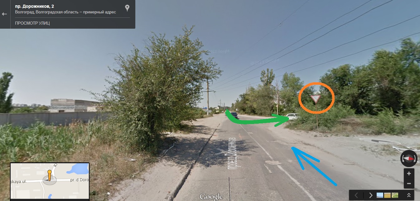 Давненько это было. Ехал я впервые по проезду Дорожников в МРЭО по направлению синей стрелки. Знака "Уступи дорогу" не было, то ли упал, то ли сорвали. (И его потом ещё очень долго не вешали). Я проехал прямо как по главной, а на обратном пути увидел знак "Главная дорога" по направлению зелёной стрелки (на Городище). Не по себе стало, когда представил, в какую переделку мог бы попасть. Но все хорошо, что хорошо кончается.