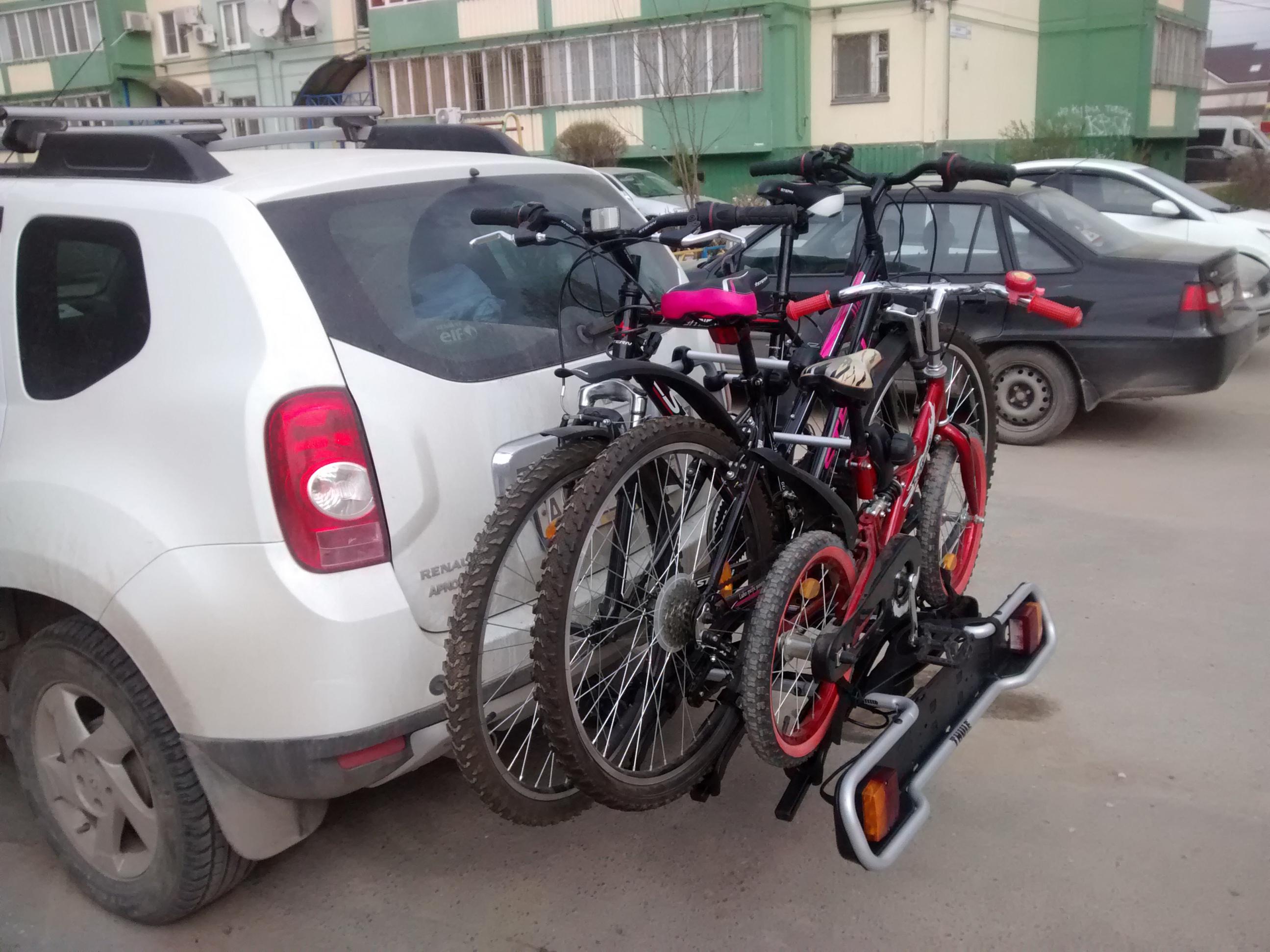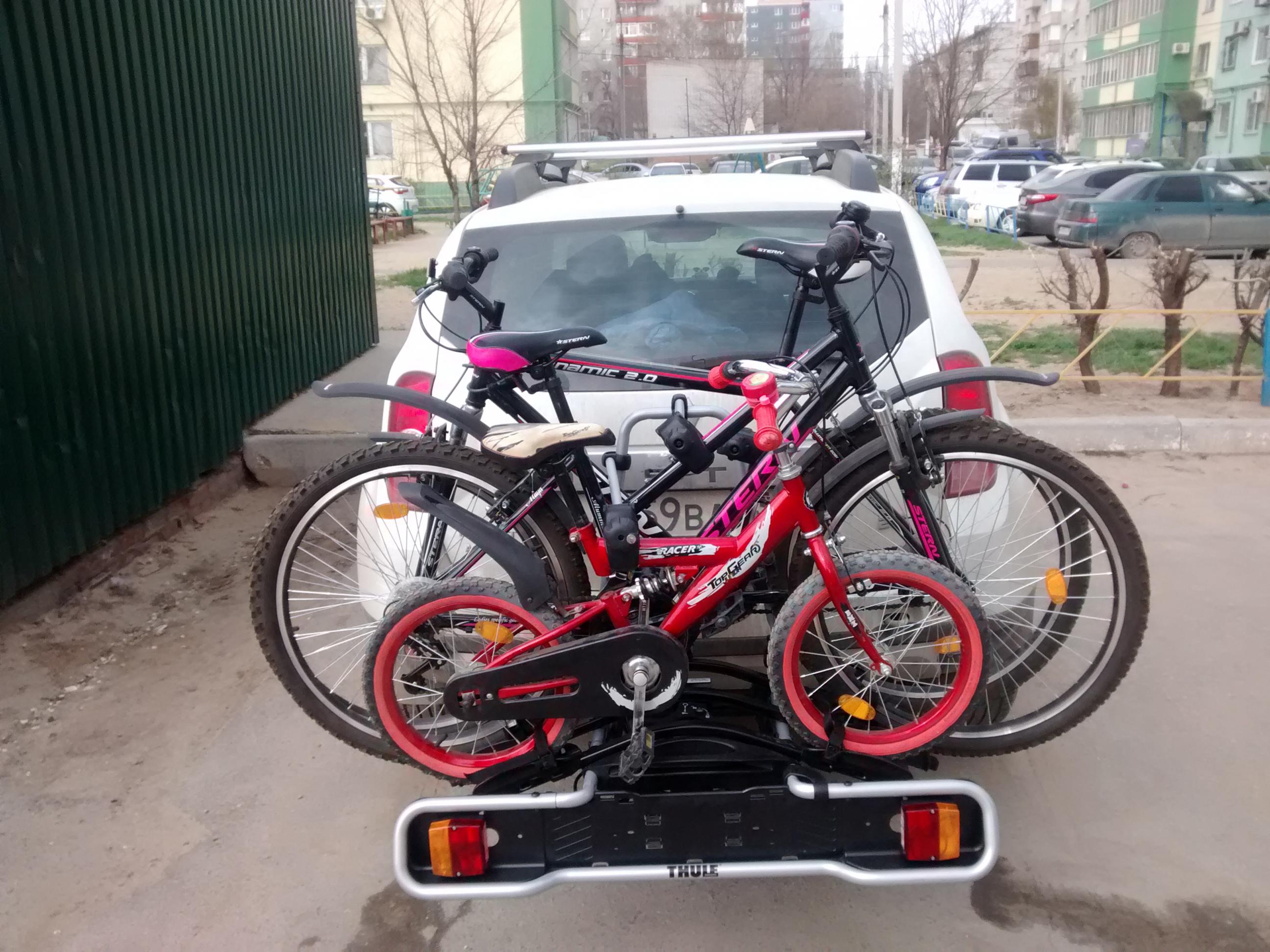 а можно вот так Но это на фаркоп, три велика - свободный доступ в багажник и можно ехать 130 кмч Они продаются под кодами Renault дешевле, чем под кодами Thule (хотя реально это Thule) вот например недорогие модели на фаркоп. Модель X-press - позволяет перевозить до 2-х велосипедов на фаркоп 7711419629 3699 Модель Hang-on - позволяет перевозить до 3-х велосипедов на фаркоп 7711422432 5299