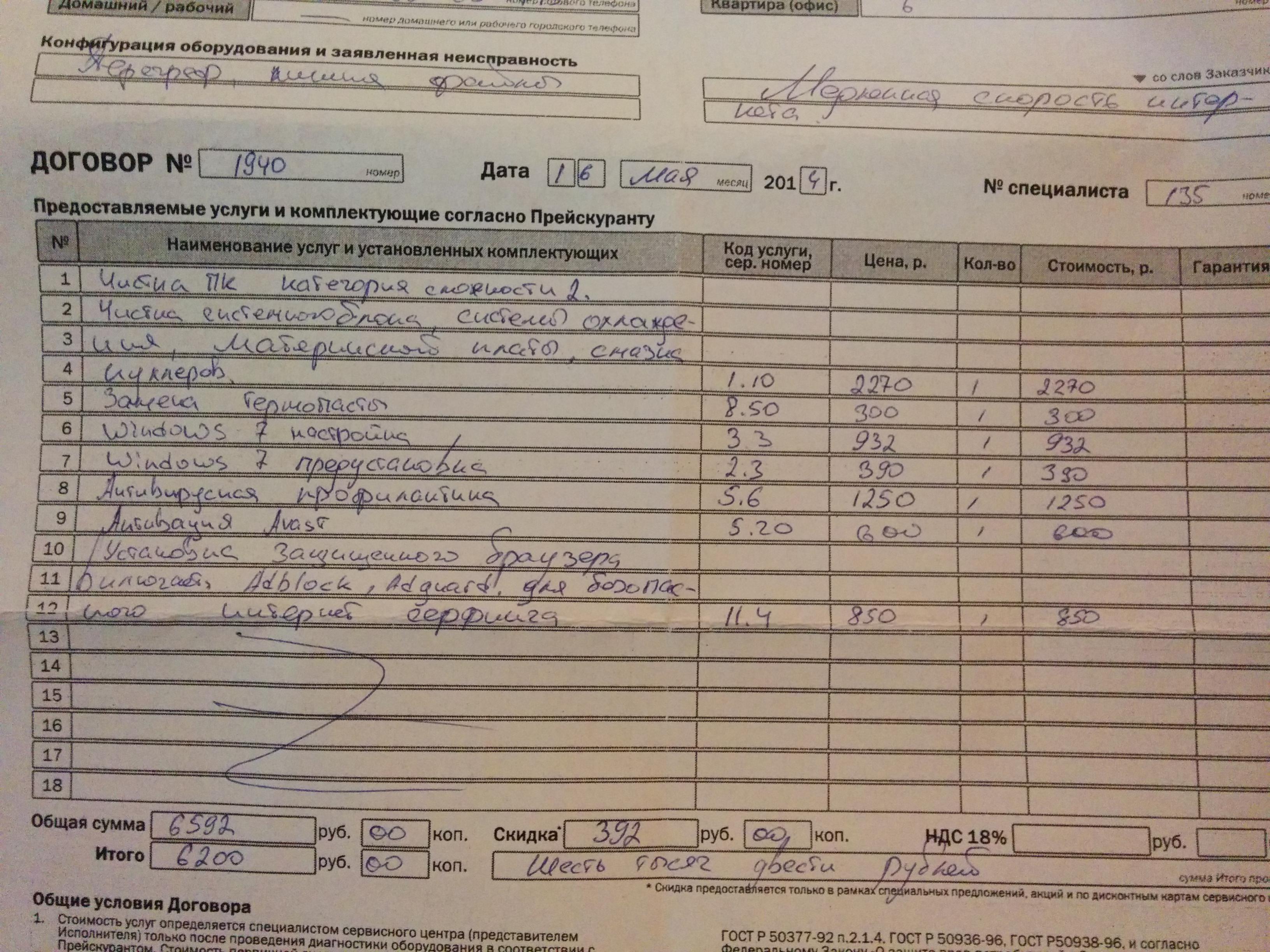 Обратились ко мне вчера знакомые с проблемой - низкая скорость интернета на одном из компьютеров дома. Но дело не в том, как я решал эту проблему, а в том, что до меня они обращались в некую контору по объявлению, представитель которой провёл целый день, но ничего не исправил, но при этом ВНИМАНИЕ взял с этой несчастной женщины 6500 рублей. Я потерял дар речи, когда мне показали акт выполненных работ. Это просто дно, я думал такое бывает только в интернет-байках. Причём эта гнида реально только хуже сделала. Он установил винду 7ку на древний пентиум4 с 1 гигом оперативы, не активировал её, криво поставил кулер, так что он болтался на двух клипсах, из-за чего температура даже в простое 90 градусов была, плюс (см скриншот) сделал ещё много чего, чего вообще не нужно было делать и оно не имело отношения к проблеме. В итоге помимо медленного интернета прибавились ещё и дикие тормоза самой системы даже после того, как я закрепил кулер. Предлагаю распространить везде, чтобы это этим деятелям пусто стало