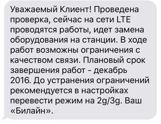Ребята, проблему по поводу LTE и связи поддерживаю, неоднократно жаловалась в службу поддержки. Отвечали, что проводят проверку в тех.блоке, даже перезванивали, понимающим и сочувствующим голосом просили подождать (вспомнила цитату нашего любимого Председателя Правительства ), но пока безрезультатно, мне говорили, что у них не так давно была произведена замена оборудования (усовершенствование) и вот это, видимо, последствия. Раза три обновляли мне настройки, обещали решить вопрос на этой неделе, вот жду понедельника. Пользоваться интернетом по прежнему просто невозможно! Такой подставы от Билайна не ожидала... Может быть есть информация поновее моей?