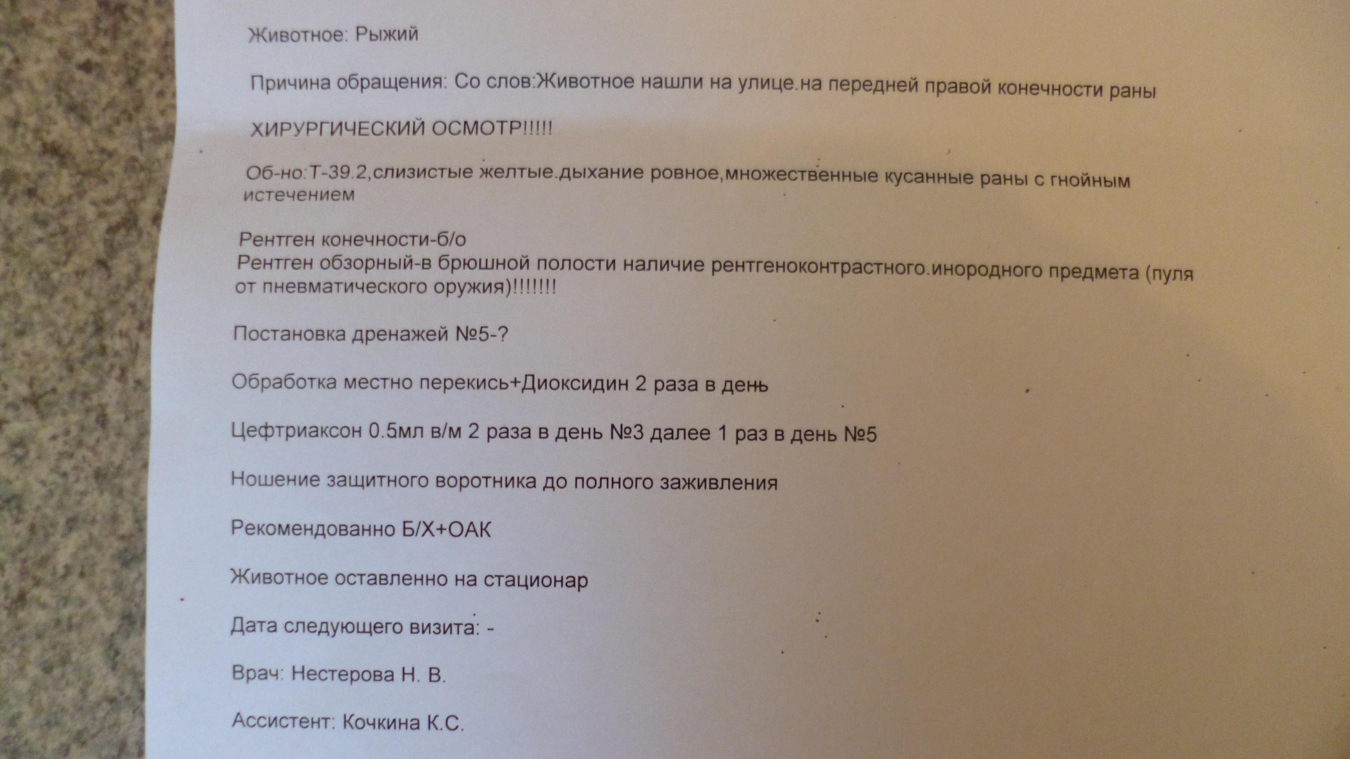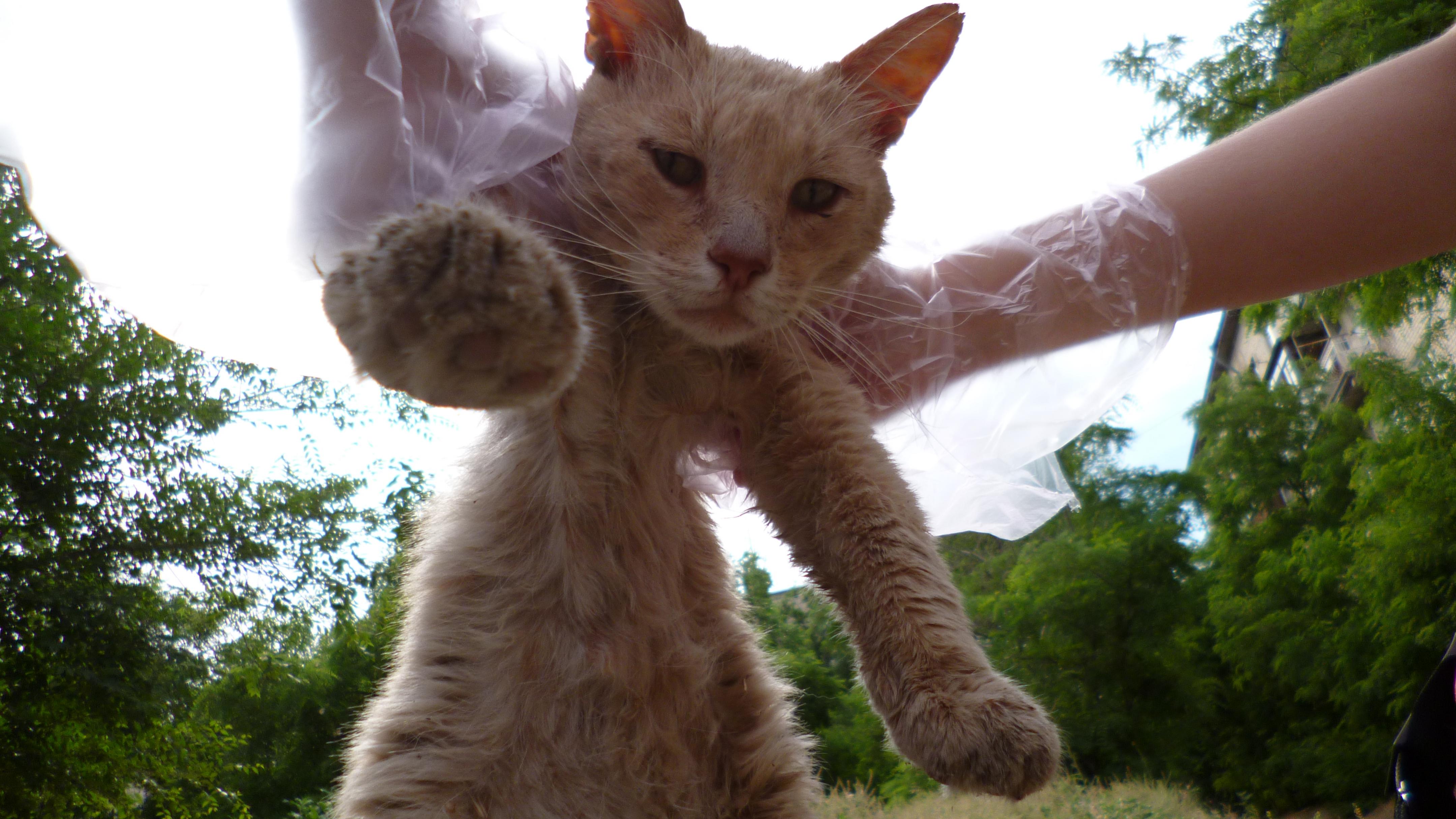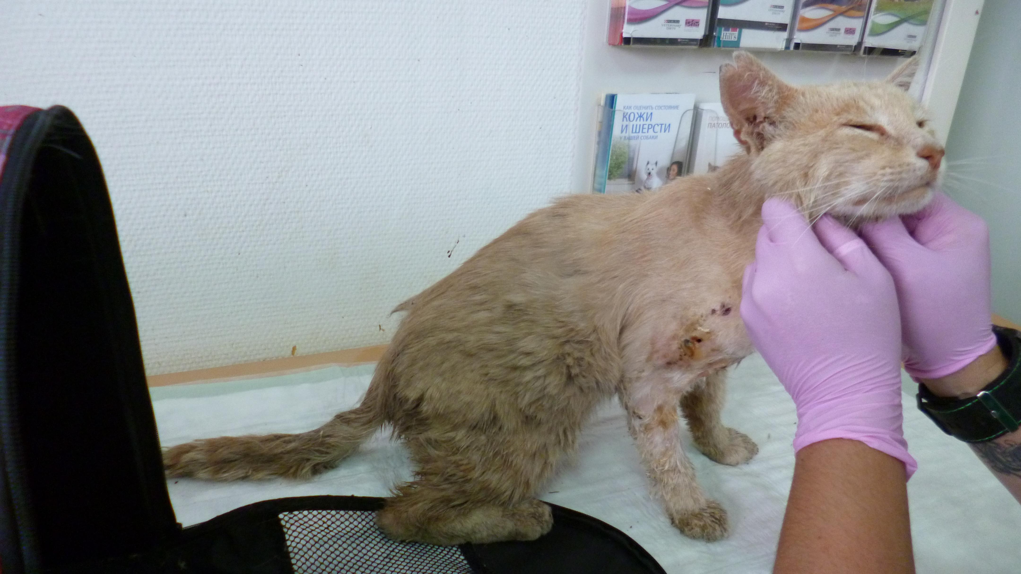 Искали мы кошку из соседней темы, и нашли кота. С девушкой Аней ( она предложила свою помощь в поиске кошки с опухолью) мы кругами обежали все дворы, но так ту кису и не обнаружили. А вышел к нам кот... Худой, почти весь лысый, в корочках, с раздутым животом, еле ходит. Посмотрели мы с Аней на него и приняли решение , что коту нельзя оставаться без мед. помощи. Раскрыли переноску и стали приглашать кота туда войти. Чуть-чуть подтолкнули его , а него из плеча вдруг засочился гной. Я видела покусанных собаками котов, но вот такого ужаса еще не встречала. Он словно весь в очагах гноя, как-будто тот разлит под кожей. Чуть надавишь, и все течет из разных отверстий. А кот спокойно себе мурлыкает. Вообще- очень спокойно себя вел, и пока я его трясла, тащила в переноске, и в маршрутке на кочках- не было ни одного непокорного мява. Отвезли кота на Ватутина. И- спасибо врачам, и особенно Наталье Нестеровой! Мне надо было возвращаться на работу, и она под свою ответственность приняла кота на осмотр и лечебные манипуляции. Через 3 часа я вернулась, а коту промыли раны, поставили дренажи, сделали уколы и вытащили пулю. По деньгам- я пока справлюсь сама, но лечение и оплата за стационар могут вогнать меня в большие долги, и тогда придется просить помощи. Но пока не прошу, а просто покажу фото кота. Богунская, 9, обратите внимание, что кто-то у вас во дворах играется с оружием.