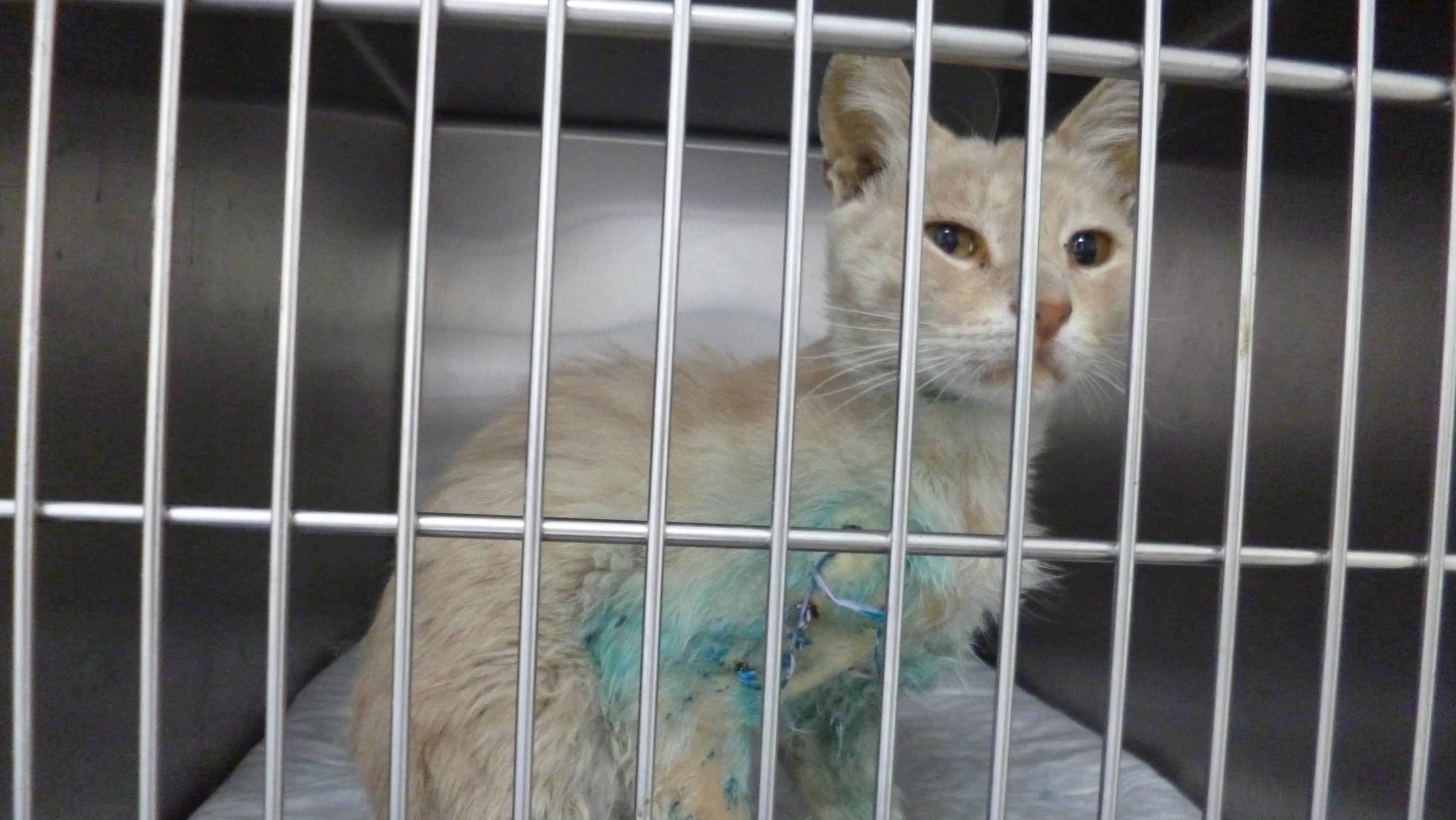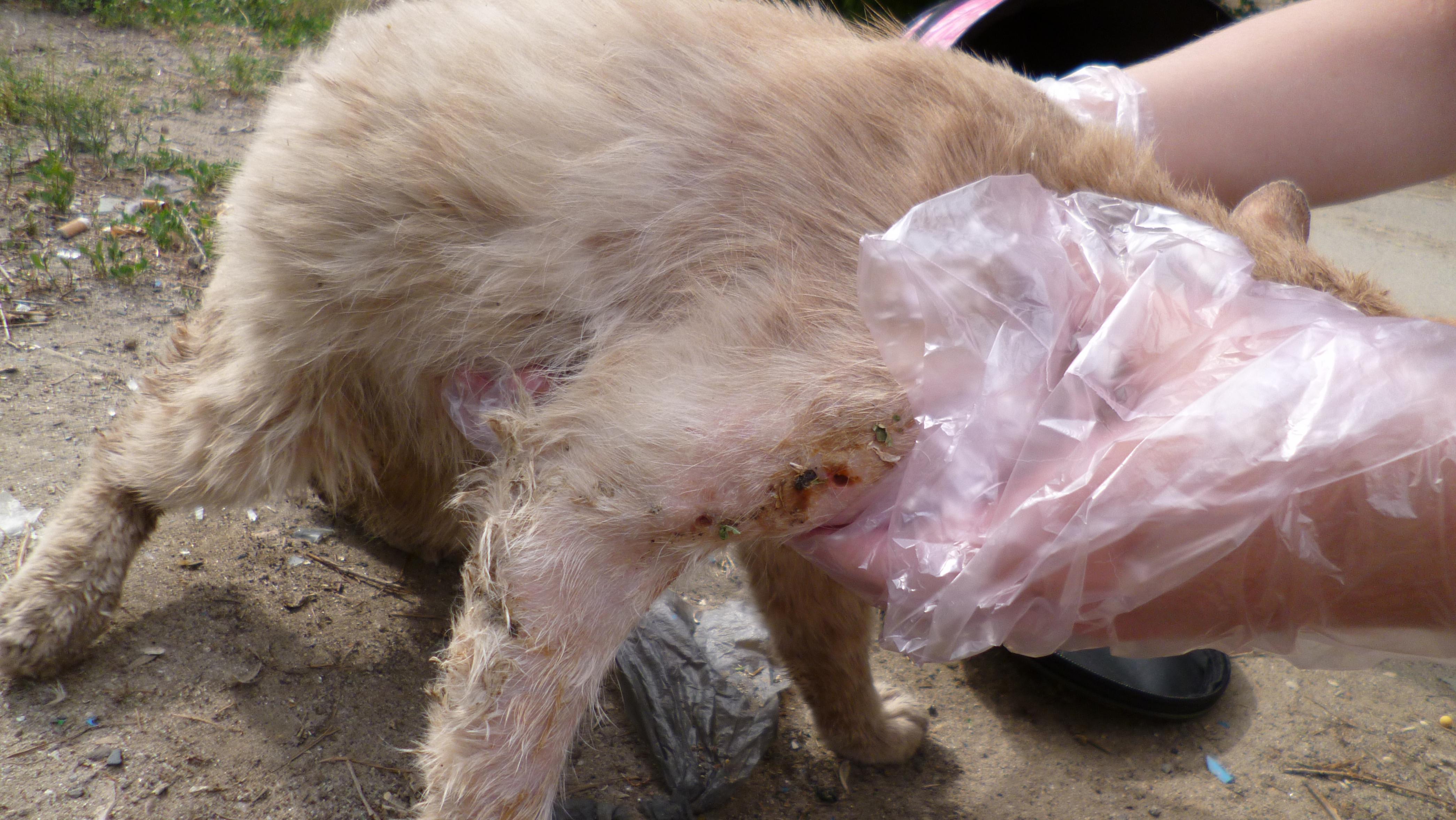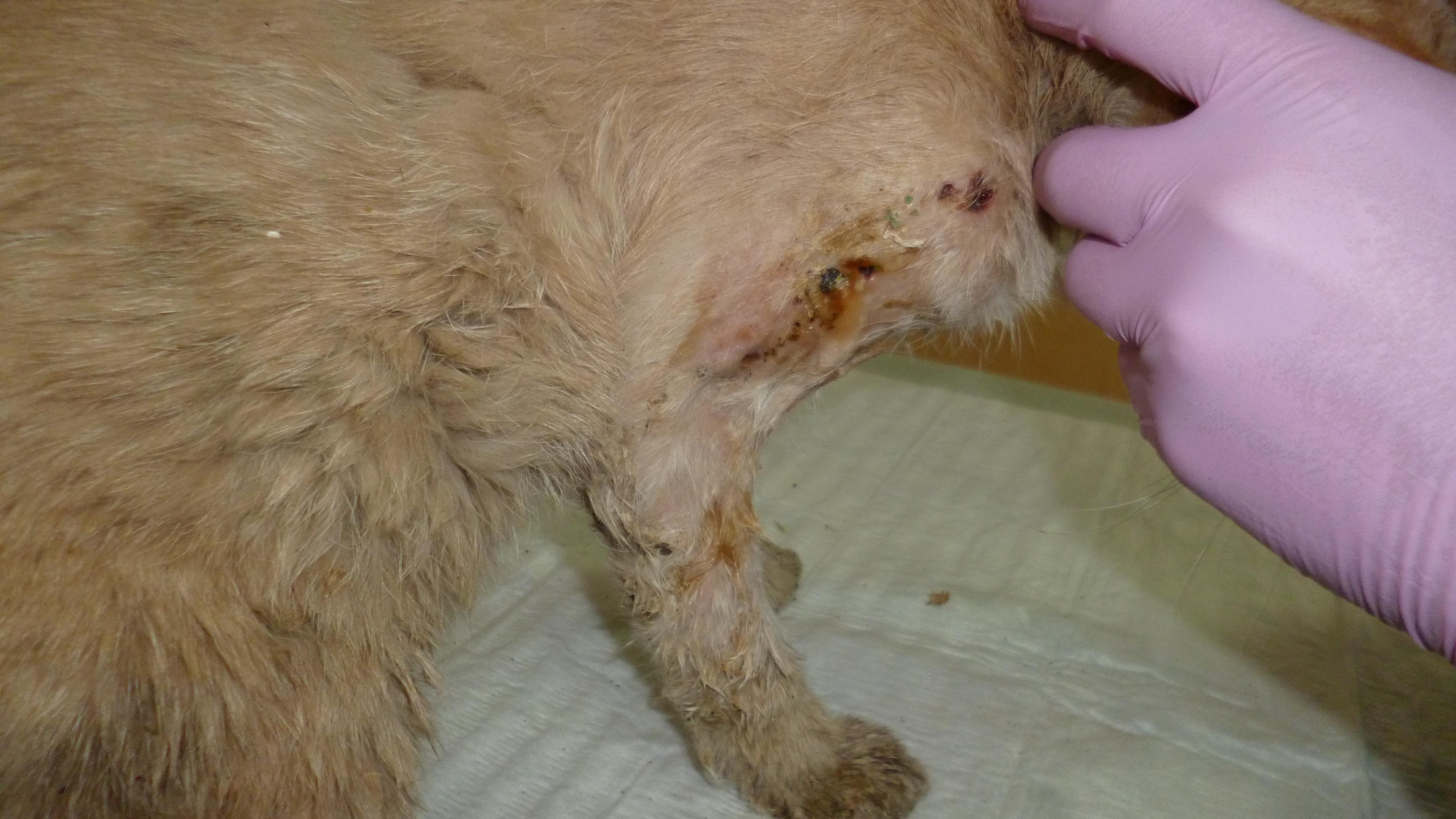 Искали мы кошку из соседней темы, и нашли кота. С девушкой Аней ( она предложила свою помощь в поиске кошки с опухолью) мы кругами обежали все дворы, но так ту кису и не обнаружили. А вышел к нам кот... Худой, почти весь лысый, в корочках, с раздутым животом, еле ходит. Посмотрели мы с Аней на него и приняли решение , что коту нельзя оставаться без мед. помощи. Раскрыли переноску и стали приглашать кота туда войти. Чуть-чуть подтолкнули его , а него из плеча вдруг засочился гной. Я видела покусанных собаками котов, но вот такого ужаса еще не встречала. Он словно весь в очагах гноя, как-будто тот разлит под кожей. Чуть надавишь, и все течет из разных отверстий. А кот спокойно себе мурлыкает. Вообще- очень спокойно себя вел, и пока я его трясла, тащила в переноске, и в маршрутке на кочках- не было ни одного непокорного мява. Отвезли кота на Ватутина. И- спасибо врачам, и особенно Наталье Нестеровой! Мне надо было возвращаться на работу, и она под свою ответственность приняла кота на осмотр и лечебные манипуляции. Через 3 часа я вернулась, а коту промыли раны, поставили дренажи, сделали уколы и вытащили пулю. По деньгам- я пока справлюсь сама, но лечение и оплата за стационар могут вогнать меня в большие долги, и тогда придется просить помощи. Но пока не прошу, а просто покажу фото кота. Богунская, 9, обратите внимание, что кто-то у вас во дворах играется с оружием.