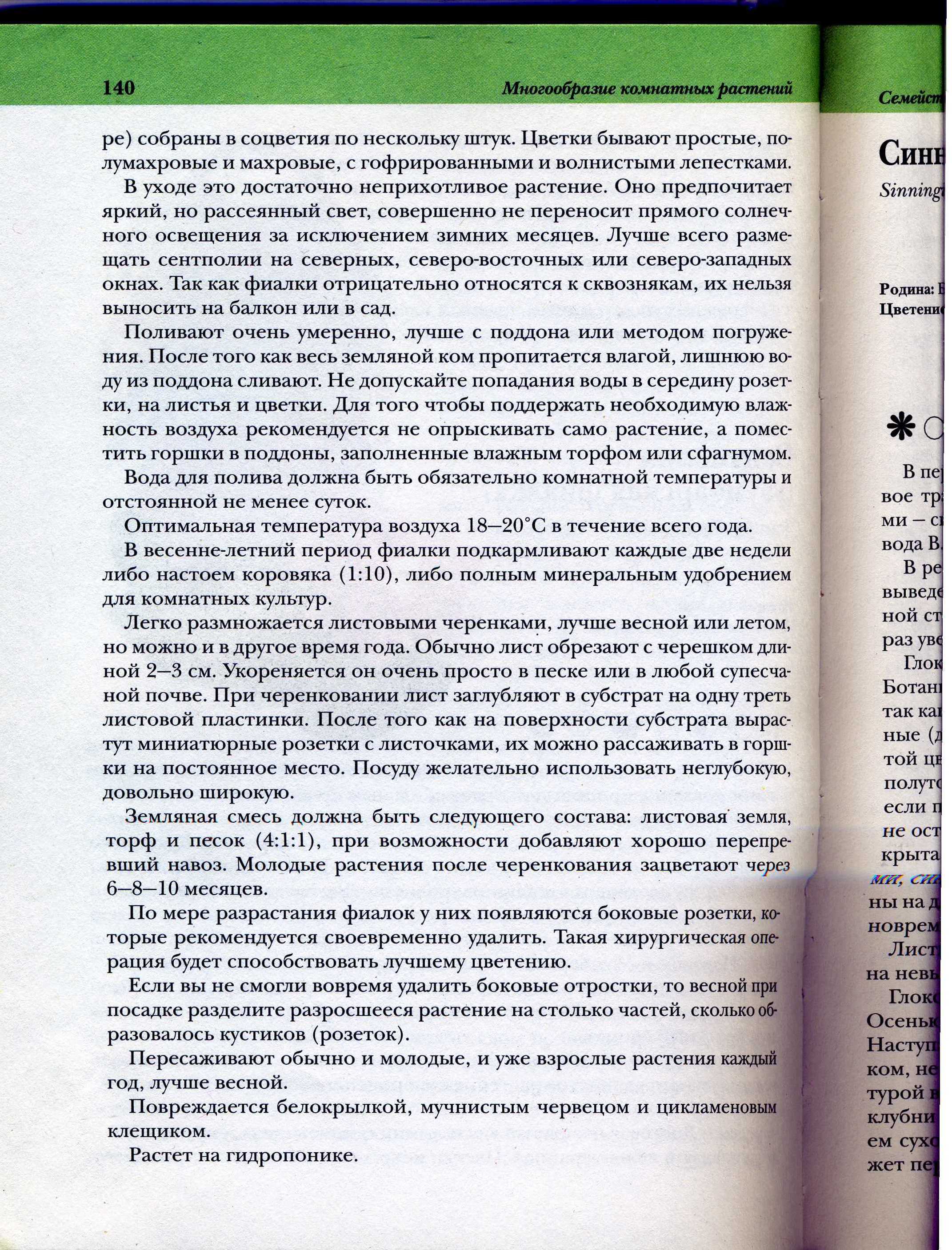 Пожалуйста Тизифона, да уж, хорошо иметь домик в деревне, желательно итальянской :) Еще раз измерила горшочки - у той фиалки, которая имеет упругие листья 9х12, у которой мягкие 8х14, первая цифра высота, вторая диаметр сверху, снизу меньше. И тут еще из книжки страничка об уходе за фиалками.