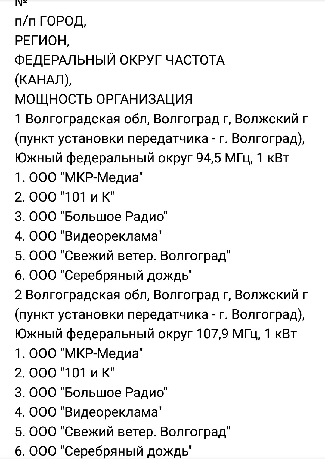 Вроде актуальный список ФМ-радиостанций в Волгограде 92.60 Радио Вера 93.40 Волгоград 24 93.80 Радио Мир 94.90 Радио 7 95.30 Маяк 95.70 Детское радио 96.10 Love Radio 96.50 Комсомольская правда 97.20 Наше Радио 97.60 Радио Дача 97.80 Белый Лебедь 98.30 Радио России 98.80 Энерджи 99.20 Максимум 100.00 Шансон 100.60 Европа Плюс 101.10 Эхо Москвы 101.50 Волгоград FM 102.00 Новая Волна 102.60 Ретро ФМ 103.10 Авторадио 103.60 Дорожное Радио 104.00 Новое радио 104.50 Юмор ФМ 105.10 Радио Спутник 105.60 Русское Радио 106.00 Studio 21 106.40 Радио Книга 106.80 Вести ФМ