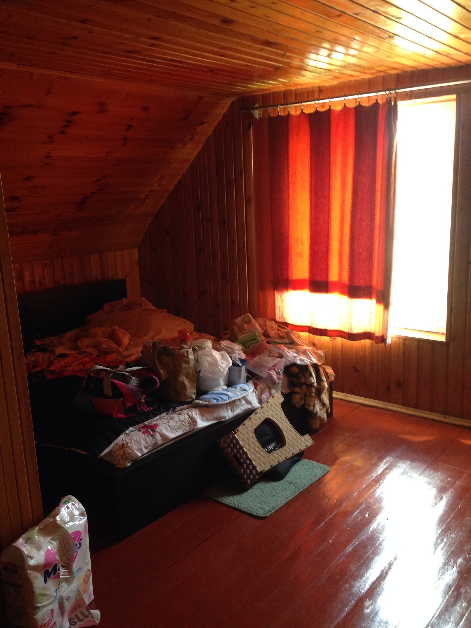 В деревне я с дочкой, у свекрови. Баня, на первом этаже парилка, душ, бассейн, на втором комната. В этой комнате мы с мужем живем с первого дня как стали приезжать к его родителям. Родители в доме. В доме на втором этаже мы не захотели, тут в бане нам комфортнее)