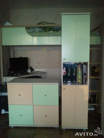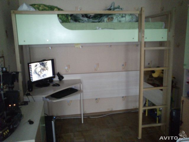 Кровать-чердак, каркас из деревянного бруса, с ортопедическим матрацем 2120х975х1875, стол компьютерный угловой 840х840х754, комод 840х398х782, шкаф 420х398х1840. Стол и комод для экономии места можно ставить под кровать. В отличном состоянии. Цена 8000 руб. Торг. тел.8-904-755-82-94.