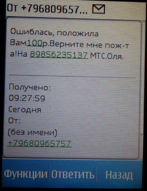 блин, вот из за таких разводил мне деньги не вернули...Хотя не особо рассчитывала. Но я с карты сбера зачислила с просони дочери 100р на телефон, и одну цифру перепутала (полусонная). Она в лагере была летом... Когда дшло до меня, написала на этот номер смс, назвала какое имя высветилось в оповещении с номера 900 (обычно приходит текст, типа Имя Отчество Ф. перевела на ваш номер 100р), но мне так и не перечислили... Позже написала: Пользуйтесь на здоровье.... Так что. если кто то читающий эту тему, в июле прошлого года получал такую смс от Анны Денисовны О., то знайте - это не развод