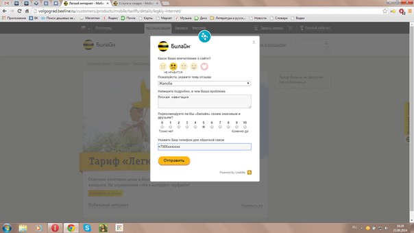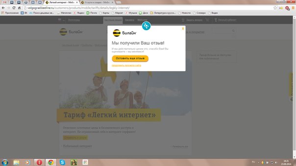 Неожиданно обнаружил отмену тарифа Легкий интернет или как его там для модема. Недоволен. Меня вполне устраивало 245 руб, платить 400 за хайвей 30 гб принципиально не буду, не нужны они мне, коекак обнаружил на сайте вроде другие тарифы, даже вроде умудрился отправить заявку на подключение, 8 гб чтоли за 260 руб, и даже пришло подтвердение подключения - но деньги не списаны... Через ЛК вообще предлагается для модема только два тарифа, помегабайтный и упомянутый уже 30гб хайвей, на сайте других тарифов простым путем найти невозможно, я до сих пор не пойму как я их вообще увидел, потому что вроде бы один и тото же алгоритм навигации(я сам уже запутался...) приводит к совершенно разным результатам. ЗЫ: Еще достала табличка с предложением оценить сайт, на самом сайте сделать это не удалось, так что напишу здесь, сайт убогейший, верх идиодитизма, когда я захожу по адресу волгоград.билайн.ру, усомнение, а ваш регион точно волгоград?Нет, ханты-мансийск...
