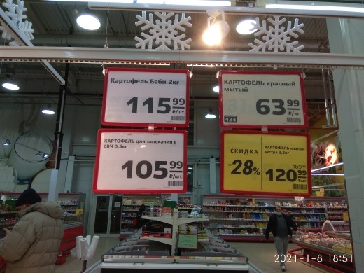 Но не по тройной же цене. И не по 105 рублей за полкило. Обычно на рынке у продавца есть несколько сортов картошки: красная, желтая, крупная, мелкая. Там и можно взять для жарки, варки и т.д. Вся примерно по одной цене около 30 рублей за кг.