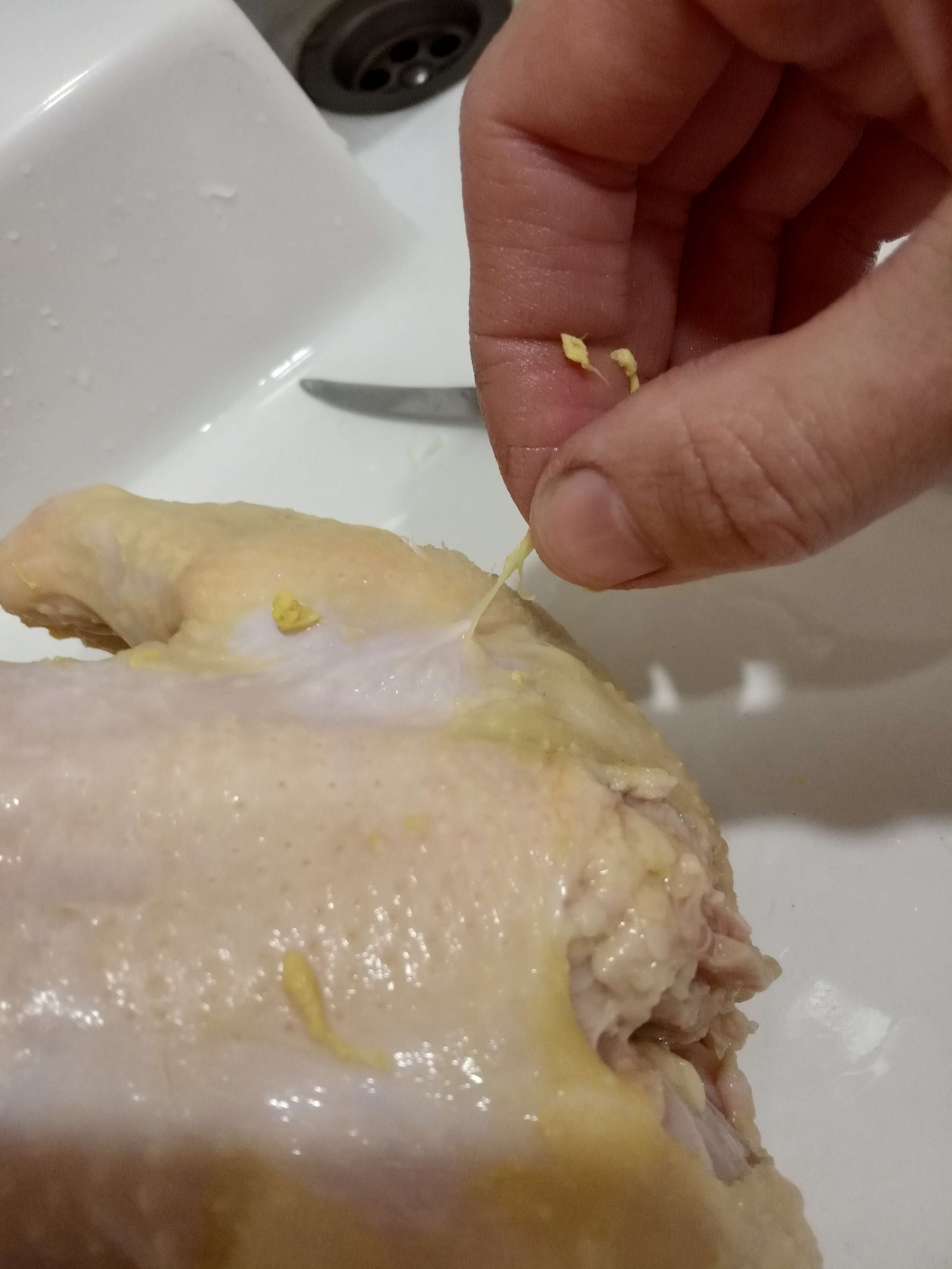 Кожу снять и все. Если не жарить целиком тушку, то кожа и не нужна. Тушу без кожи вымочить в воде. Вообще на таких курах всегда желательно читать состав. Если там что-то нашпиговано, то пишут. Особенно это касается всяких «цыплят для жарки». На обычной курице просто «тушка цыплёнка-бройлера».