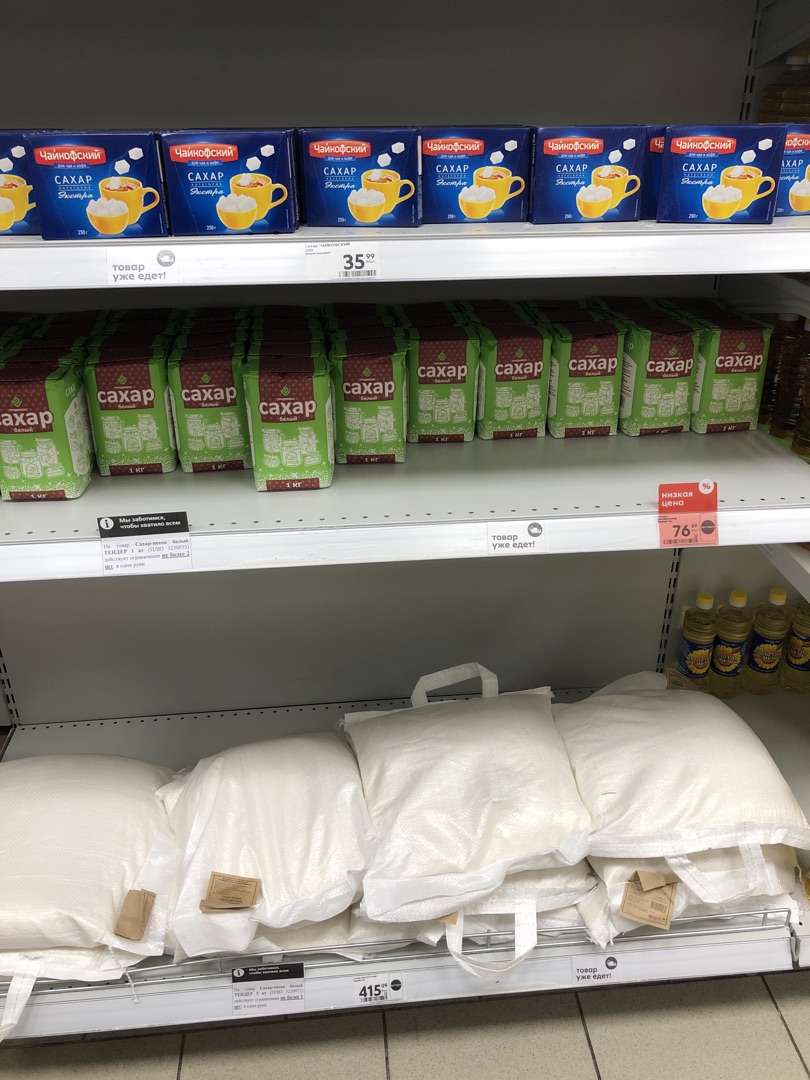 Думал с сахаром все закончили и цены падают,ан нет.Магнит - сахара нет никакого.Перекресток - 94р. дней 4-5 назад был 87р. Бабки стоят перед сахаром и мнутся,одна говорит,в Кировском в магните по 62р.,не понимаю почему в Красноармейске такие цены,я говорю - Красноармейск отдельный город,тут миллионеры живут,так как нефть и химия тут нормально получают