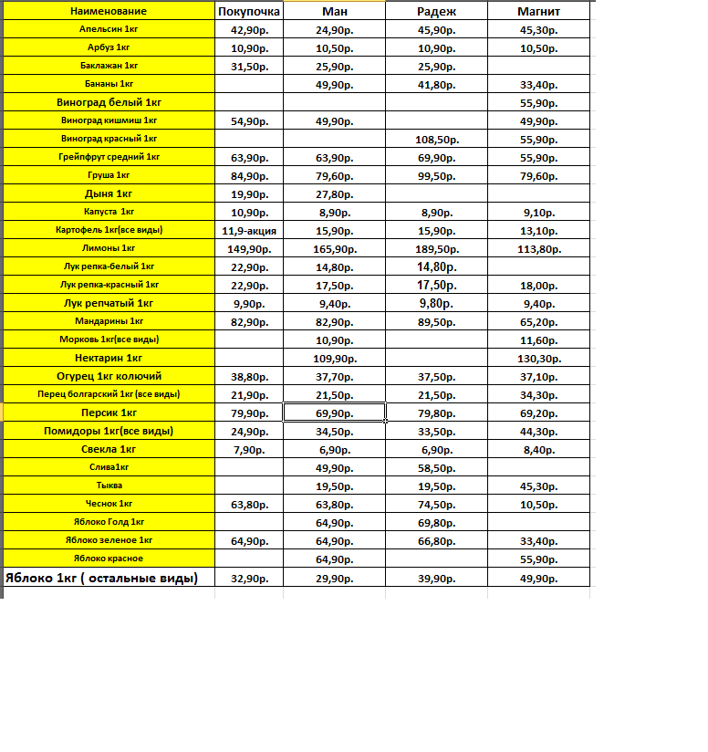 Возможно форумчанам это будет интересно,я три раза в неделю получаю мониторинг фруктов-овощей основных волгоградских сетей. Решил поделиться с вами результатами. Ниже приведен мониторинг от 15 сентября