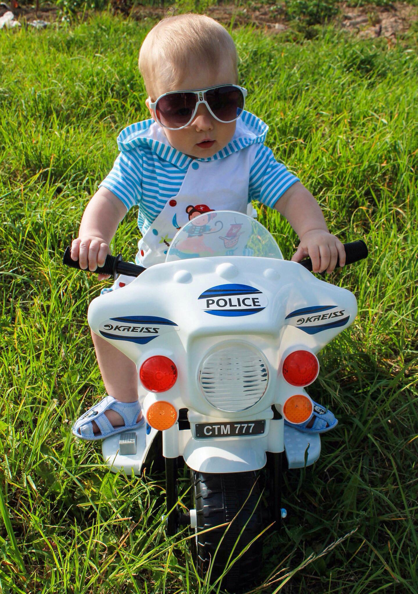 Научилась жать кнопочку на мотике и скорости вперед/назад переключать. Музыку включает, сирену, а вот рулить пока не соображает как. Бегаю как ***** за ней, рулю...